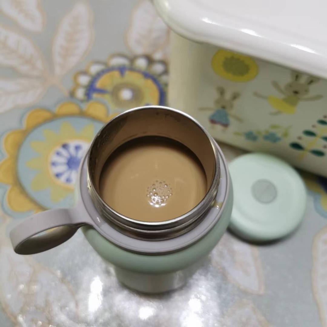 赶时间就用保温杯冲泡一杯速溶咖啡吧,牛奶加热倒入保温杯里,倒入三合一雀巢咖啡粉搅...