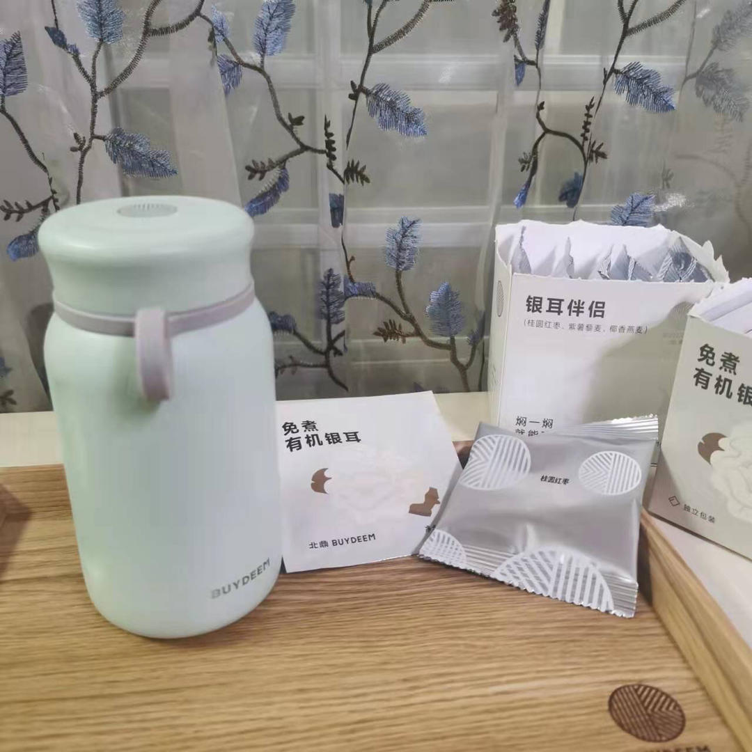 打卡北鼎有机银耳,有机银耳和银耳伴侣都倒入保温杯里,加250ml的开水,盖紧盖子...