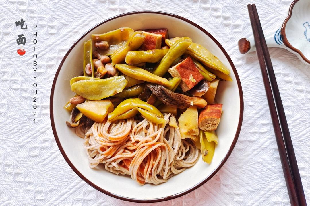用鹿茸菇、豆角、土豆和豆干炖了一锅杂蔬汤,用来拌荞麦面很不错~