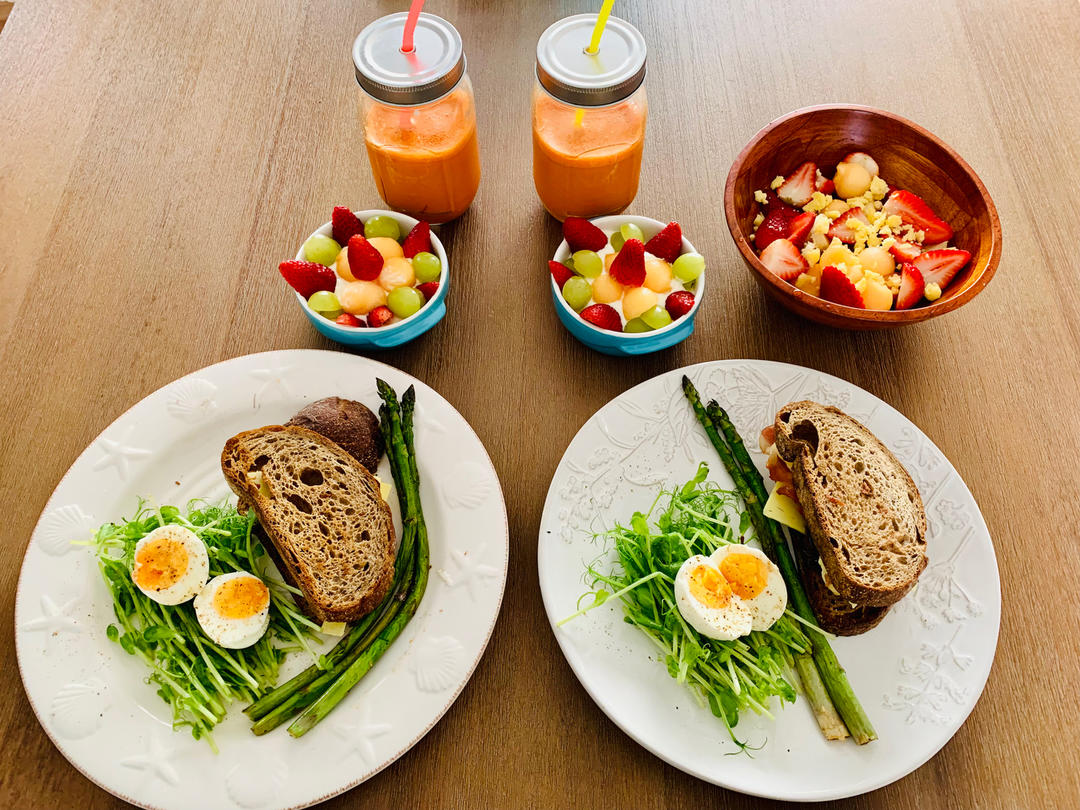 海盐黑胡椒柚子沙拉汁拌豆苗水煮蛋,煎芦笋,黑麦吐司三明治(奶酪,焦糖洋葱,培根),水果酸...
