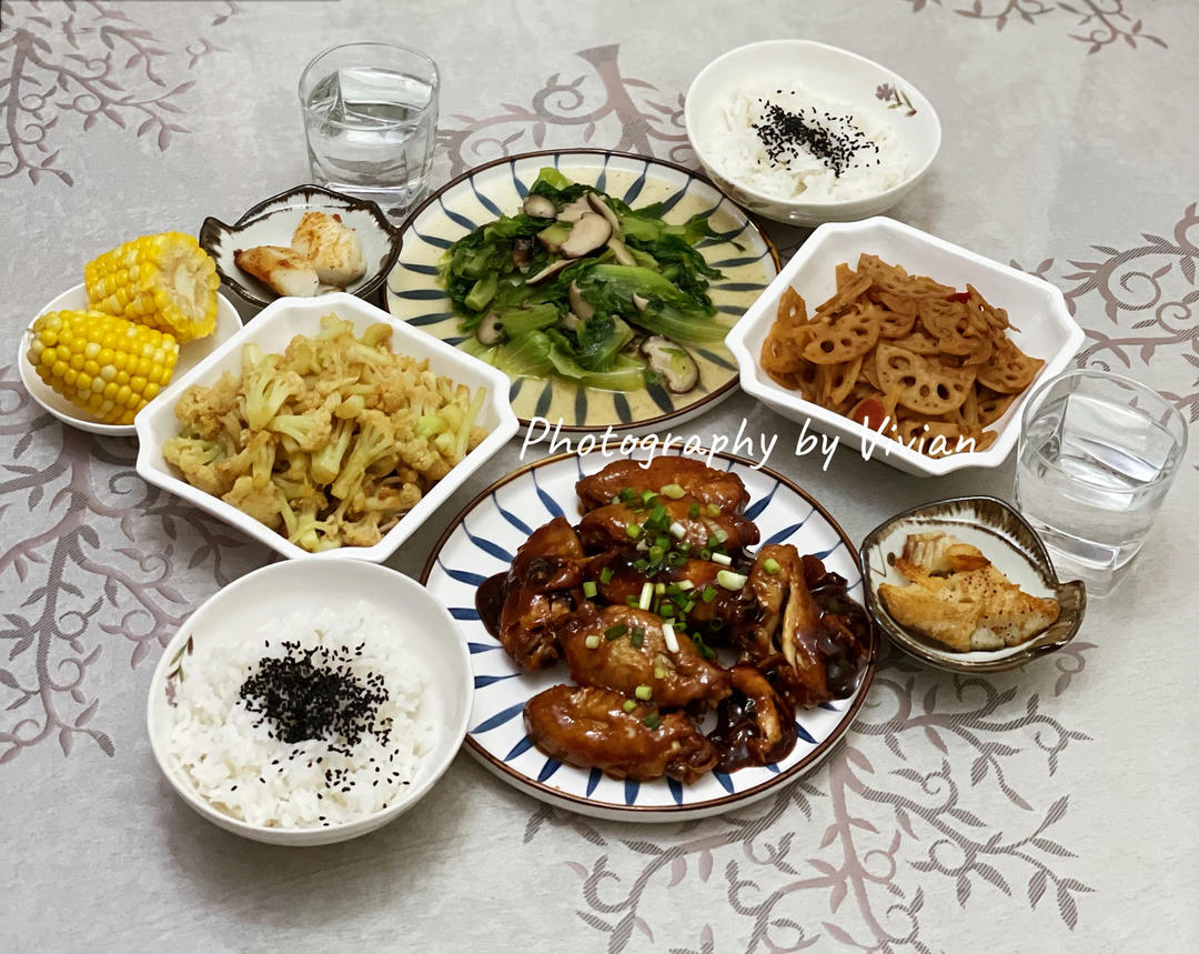 假期午晚餐|麻油鸡翅+香煎比目鱼+照烧花菜+孜然莲藕+花菇生菜+米饭+蒸玉米+乳酸菌苏打水...