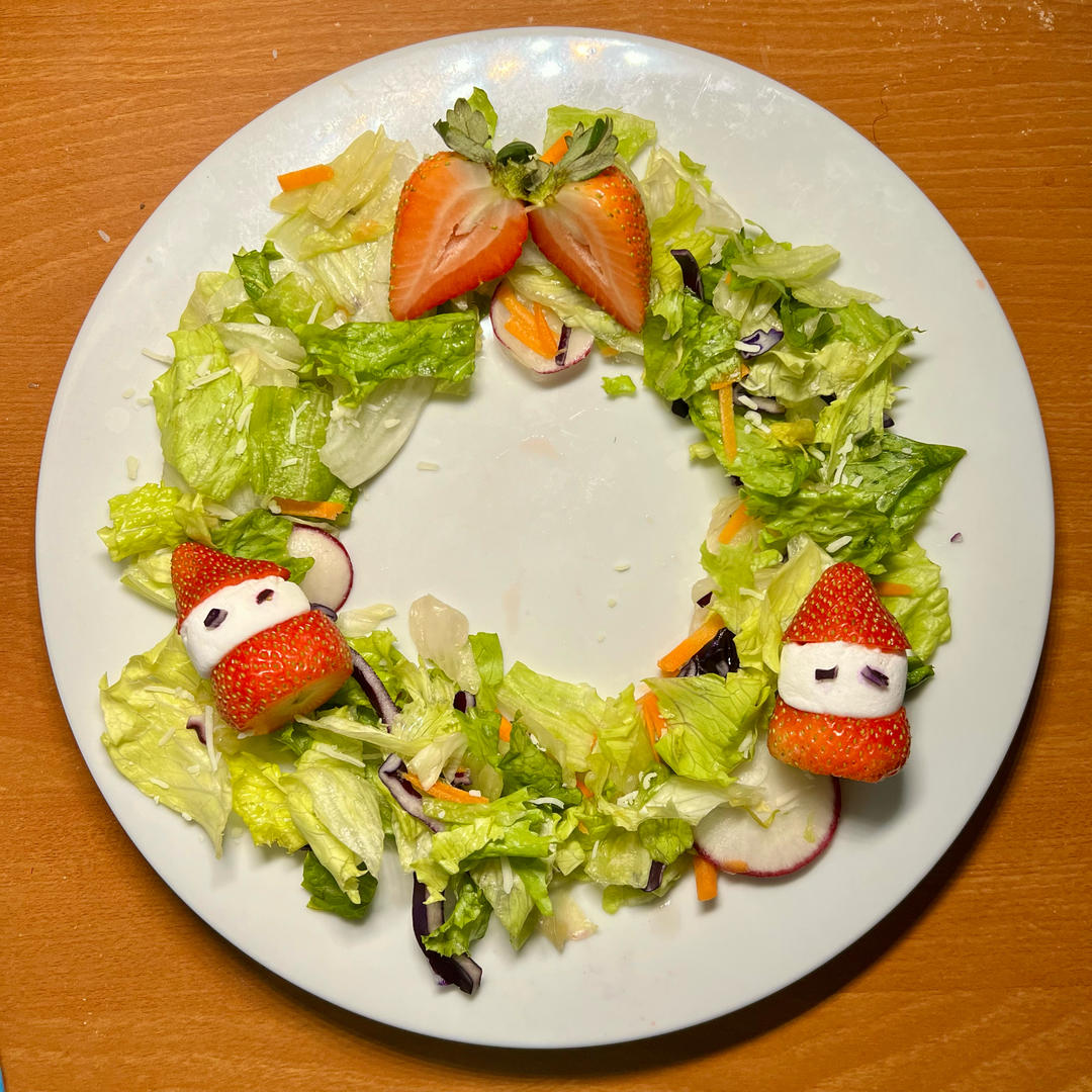特意买了一大包沙拉做这个!虽然毫无技术含量但就是烘托个节日氛围🤣~还用草莓和棉花糖做了两个小雪人(没有黑...