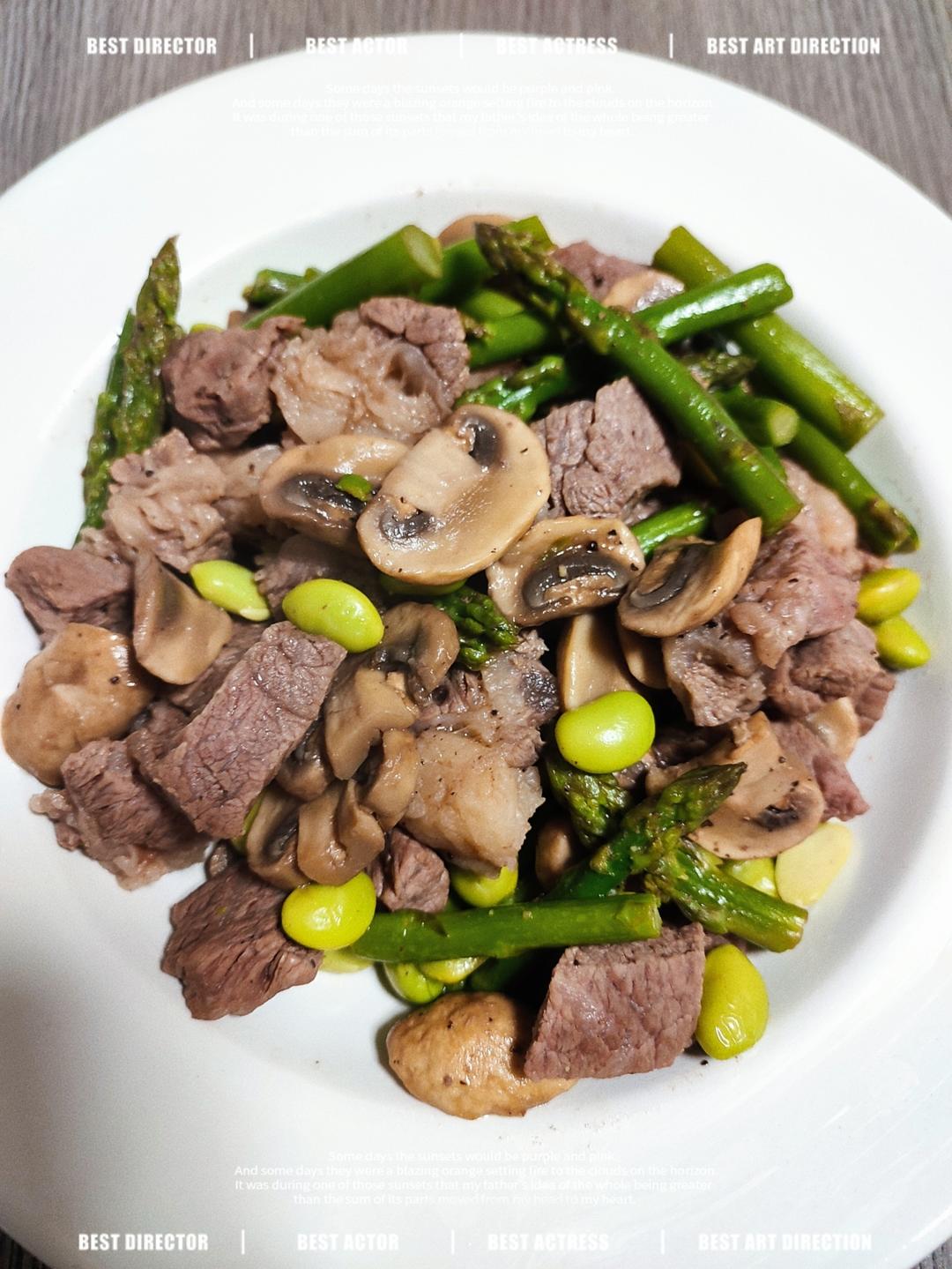 口蘑芦笋炒牛肉+杂粮饭