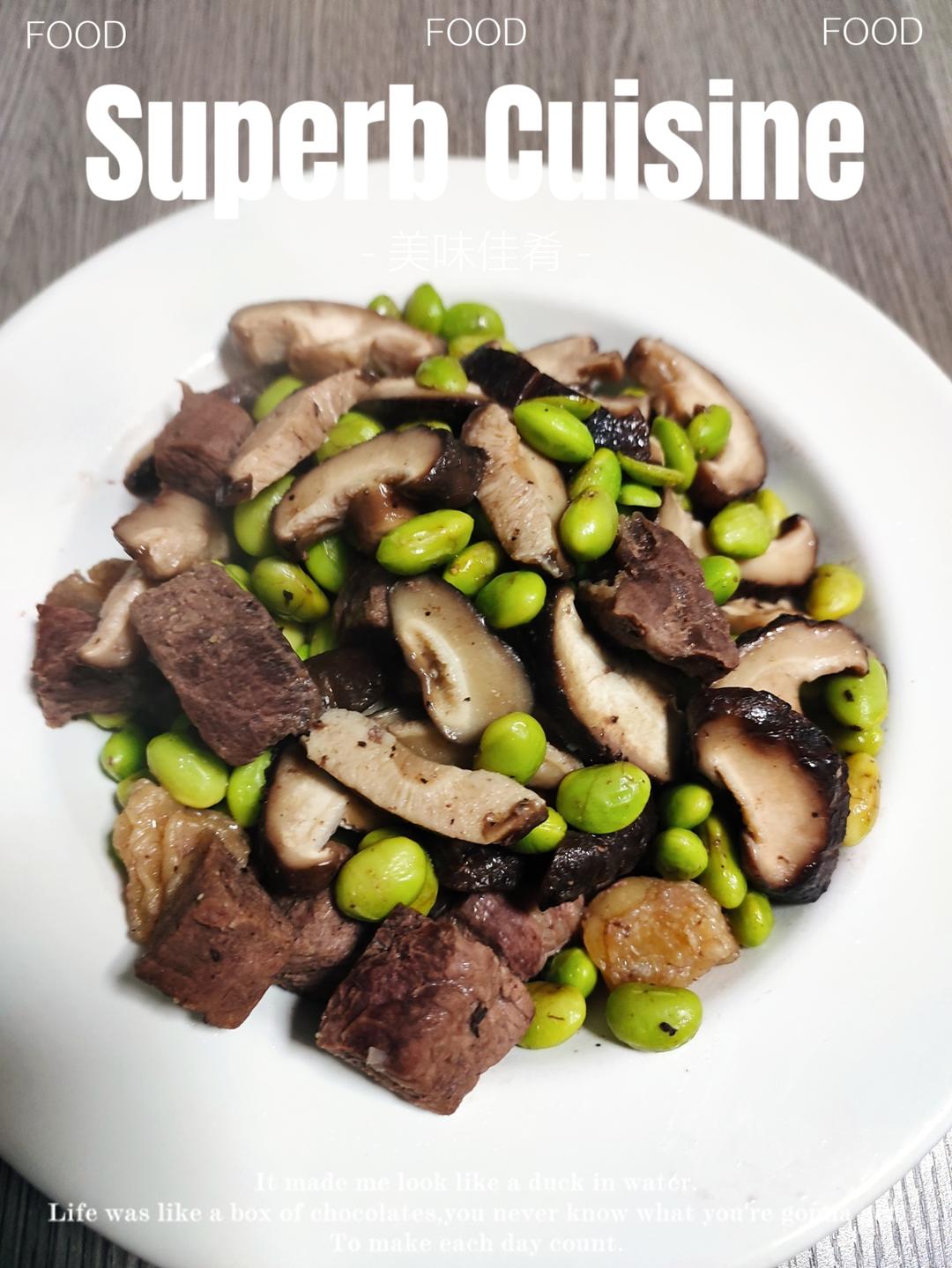 牛排肉炒花菇青豆