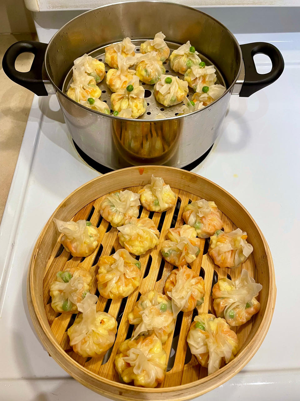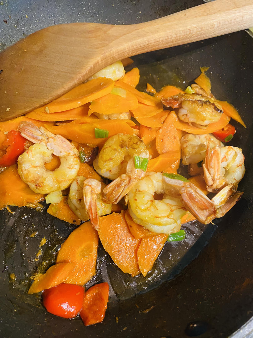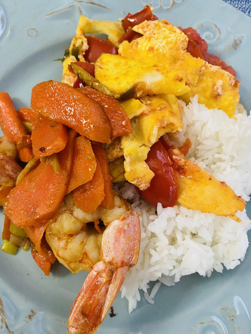 放的青豆,胡萝卜,鸡蛋,海鲜菇,虾仁。有啥放啥吧,出锅蘸甜辣酱吃,大人小孩都爱😄