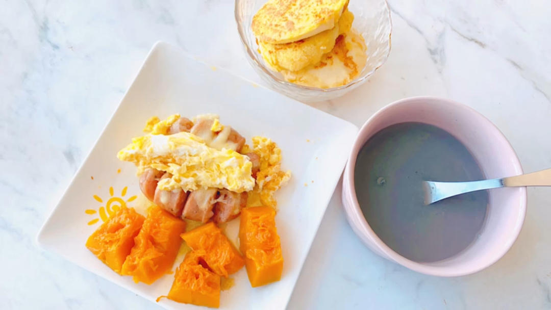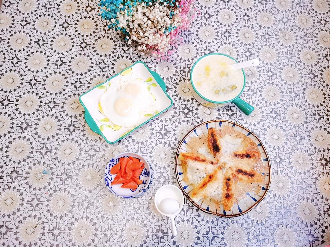 家有小学生早餐:南瓜粥+煎蛋+锅贴+鸽子蛋+泡菜