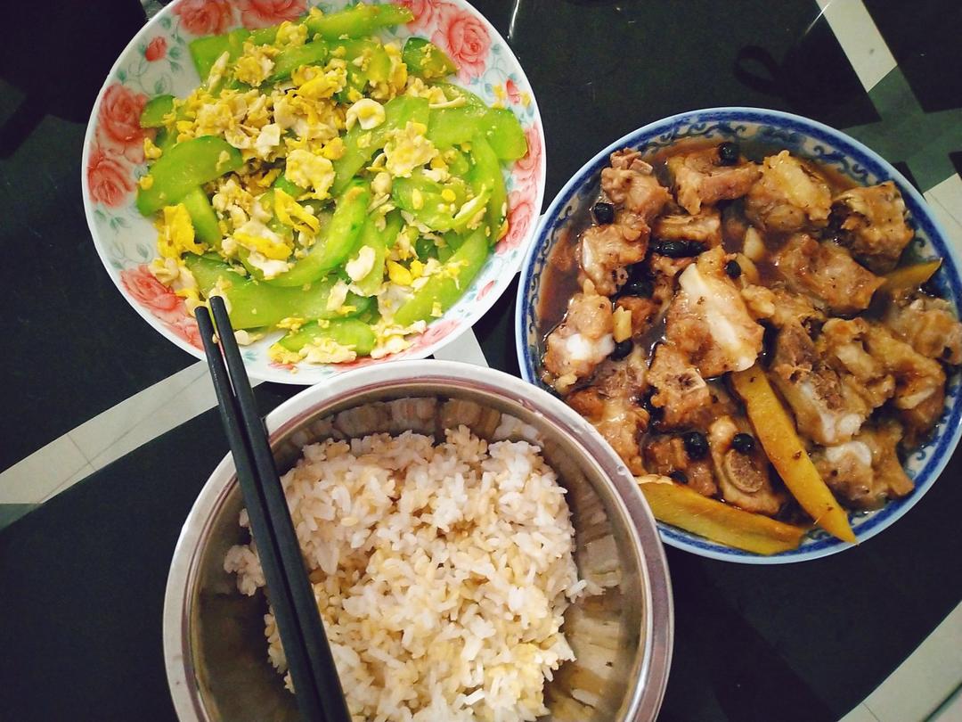 豆豉蒸排骨+黄瓜炒蛋 +糙米饭