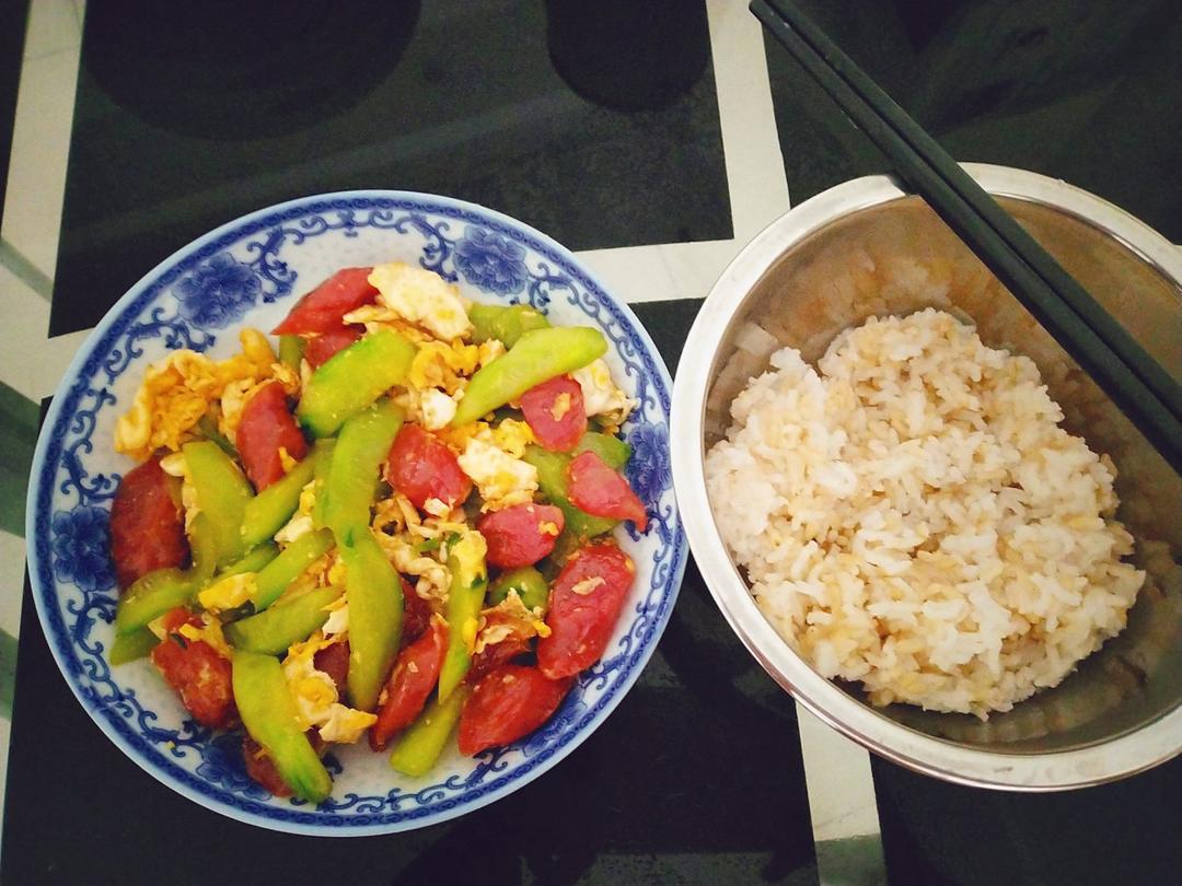 炒广式腊肠+青瓜+鸡蛋。糙米饭。
