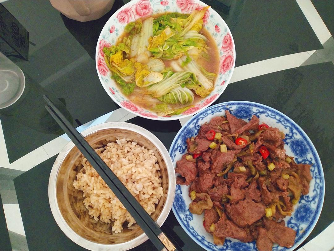 酸菜炒牛里脊+清炒白菜+糙米饭。