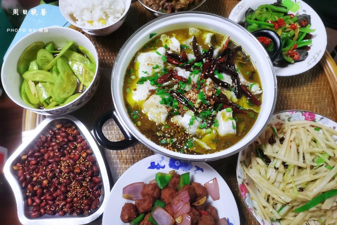 蒜片黄瓜、椒盐花生米、蒜苗炒莲菜、青椒皮蛋、板栗山药烧肉、红烧丸子、金汤酸菜鱼、小姬菇鸡汤、米饭🍚