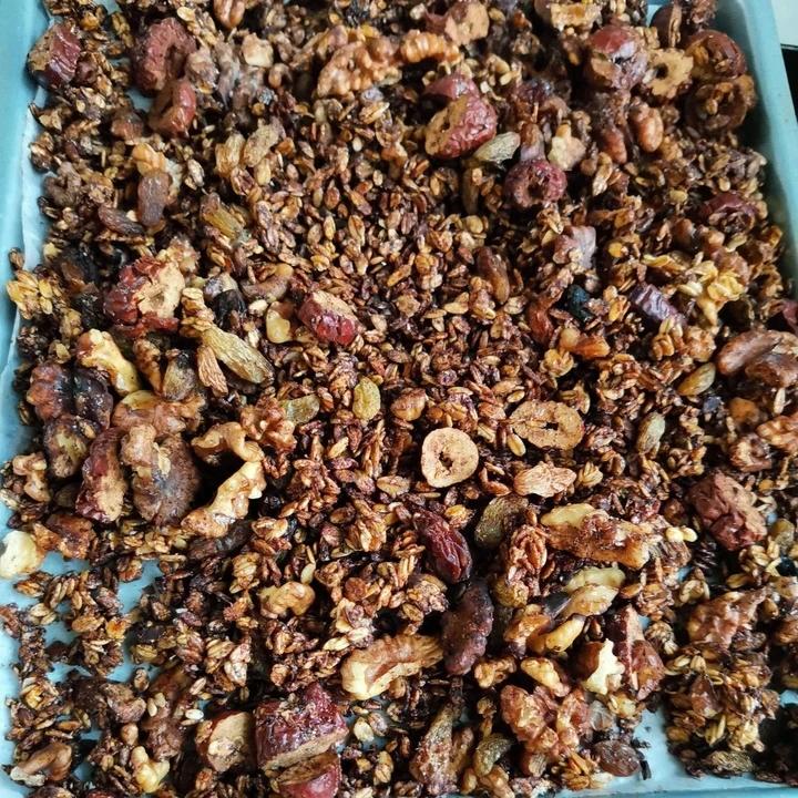 放了生麦片 红枣 核桃 葡萄干 椰子油 蜂蜜 可可粉 肉桂粉 椰蓉