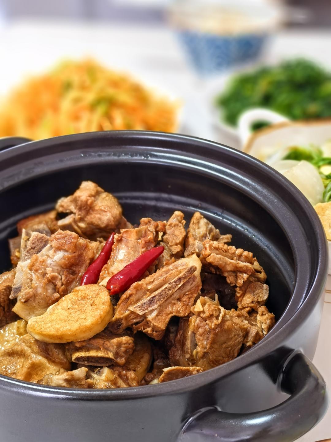素鸡烧排骨 青椒胡萝卜土豆丝 水油焖茼蒿 豆腐烧青菜