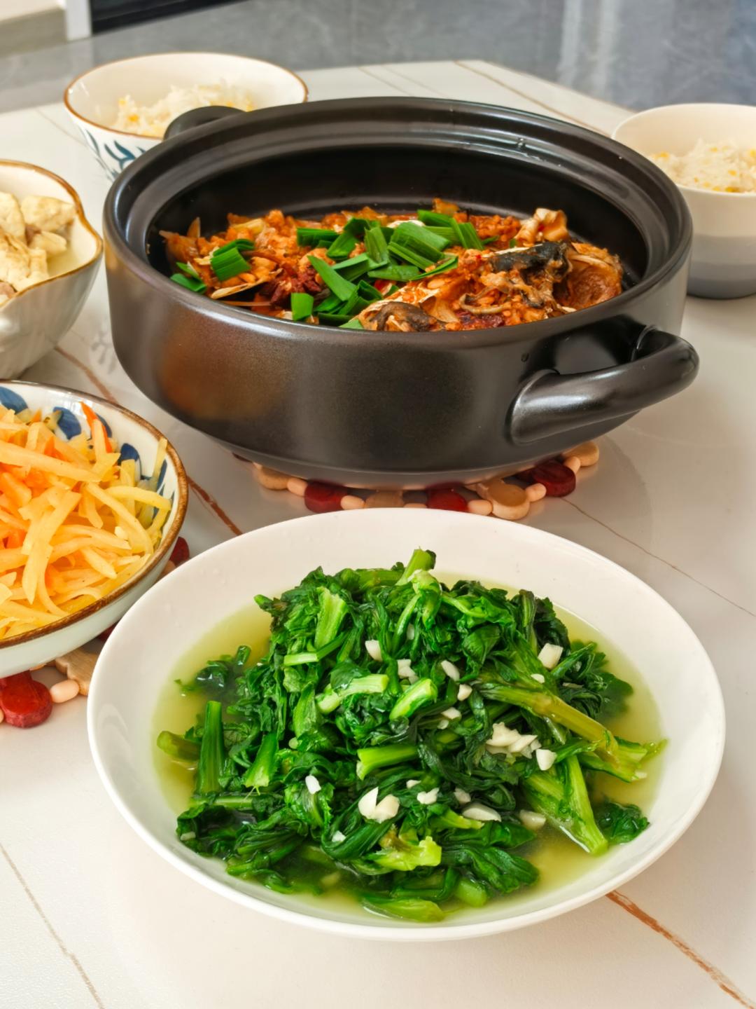 蒜子茼蒿 胡萝卜土豆丝 豆腐肉片大白菜 红烧胖鱼头