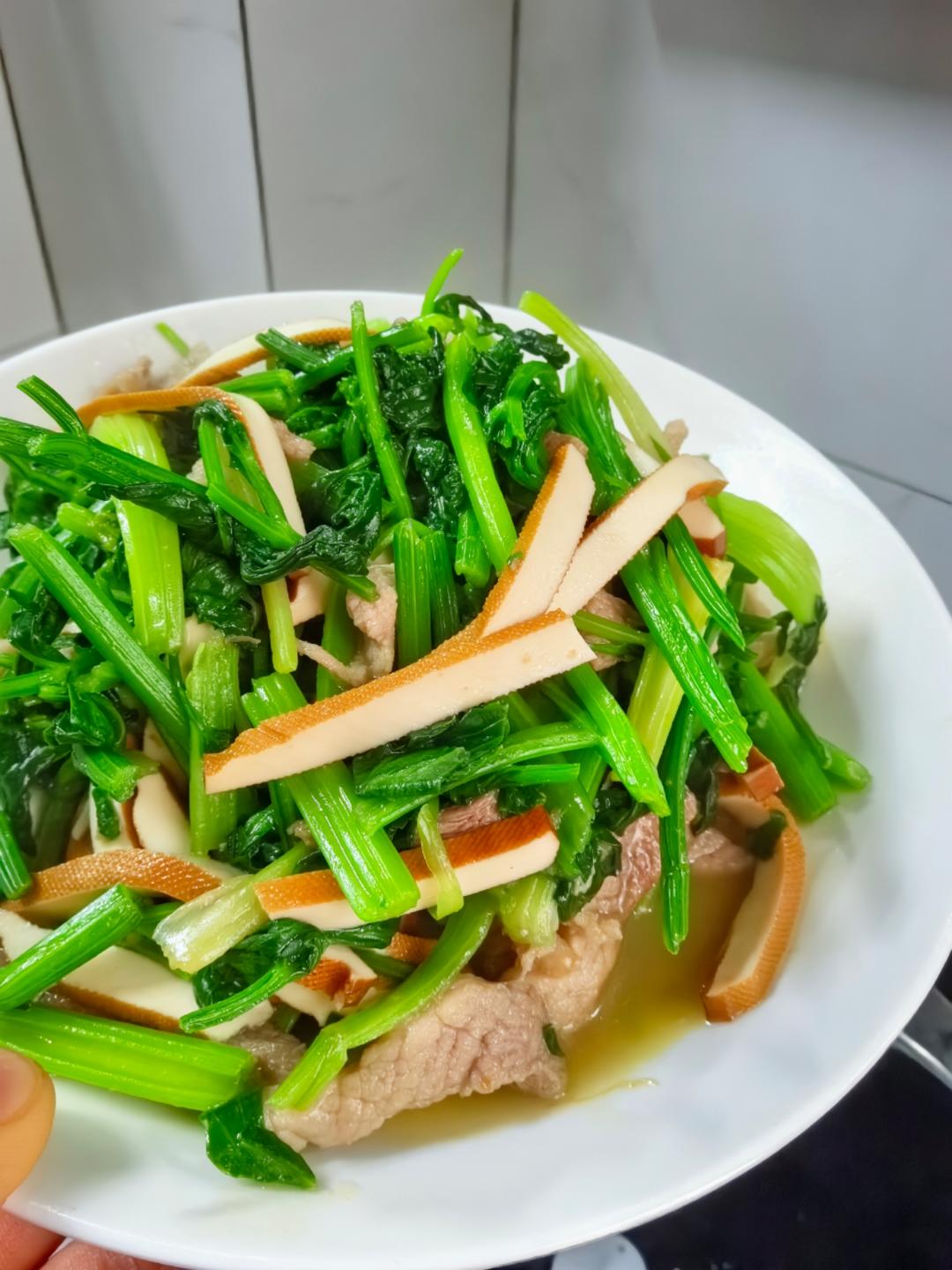芹菜豆干炒肉丝 和未入镜的红烧鸭 鸭汤焖茼蒿