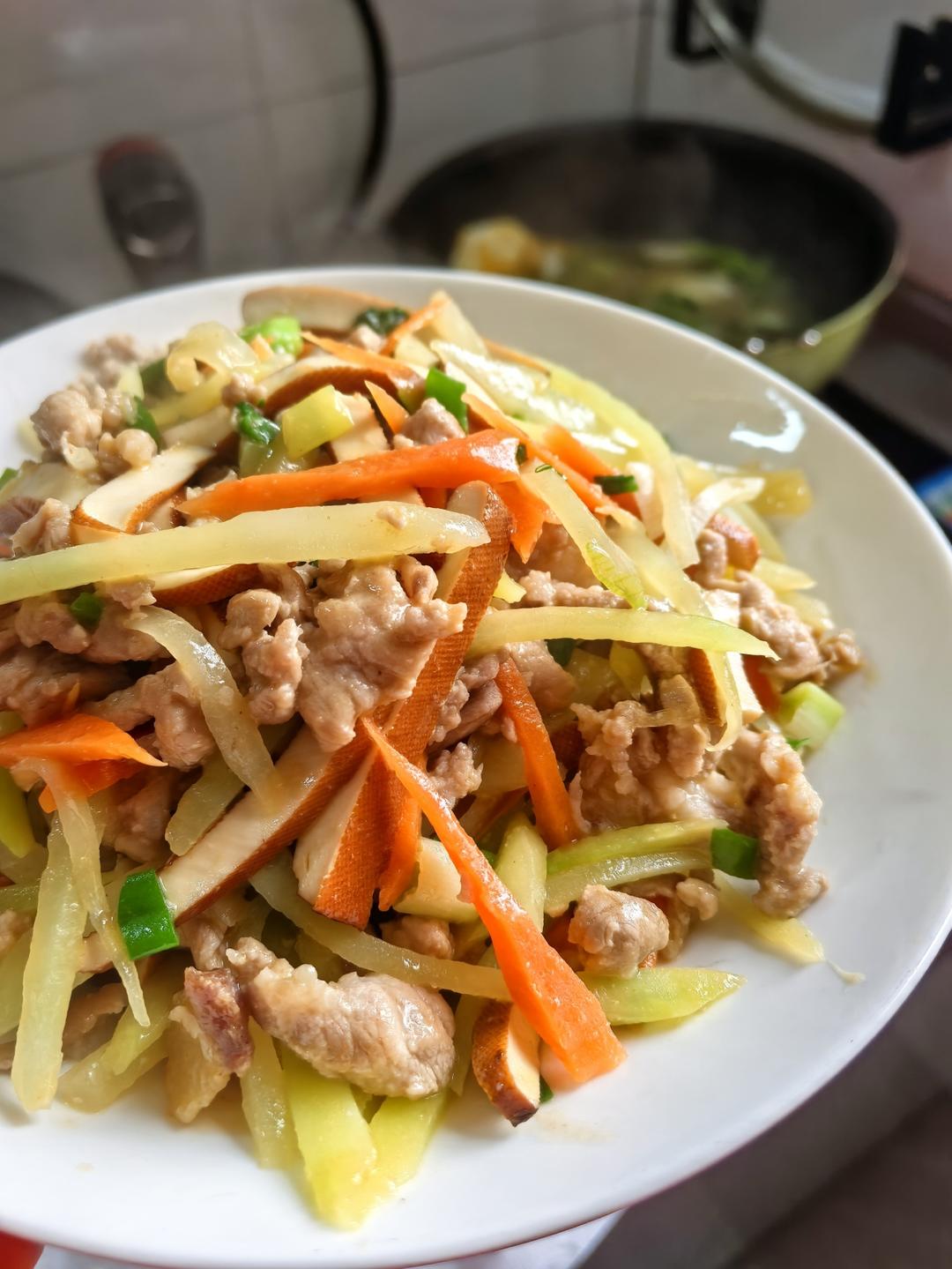 胡萝卜莴笋豆干炒肉丝 和未入镜的青菜煎蛋煮粉丝 水煮菠菜 腊鸭腿焖黄豆#一起吃午餐的日子...