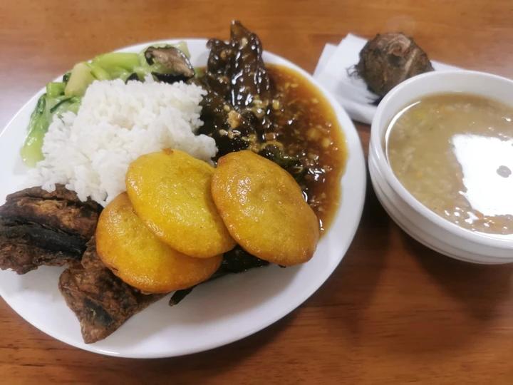黑不拉几那两块是炸咸鲅鱼。食堂又不好好做饭了。。没法吃了