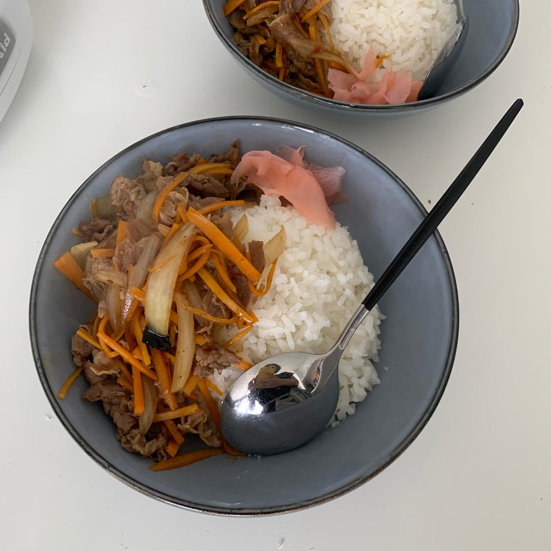 我这地方买不到金针菇和莴笋,赶紧自己生了些绿豆芽垫底。牛肉是自己切的,厚了点。外国醋很酸,不过很下饭。#午餐•2021年...