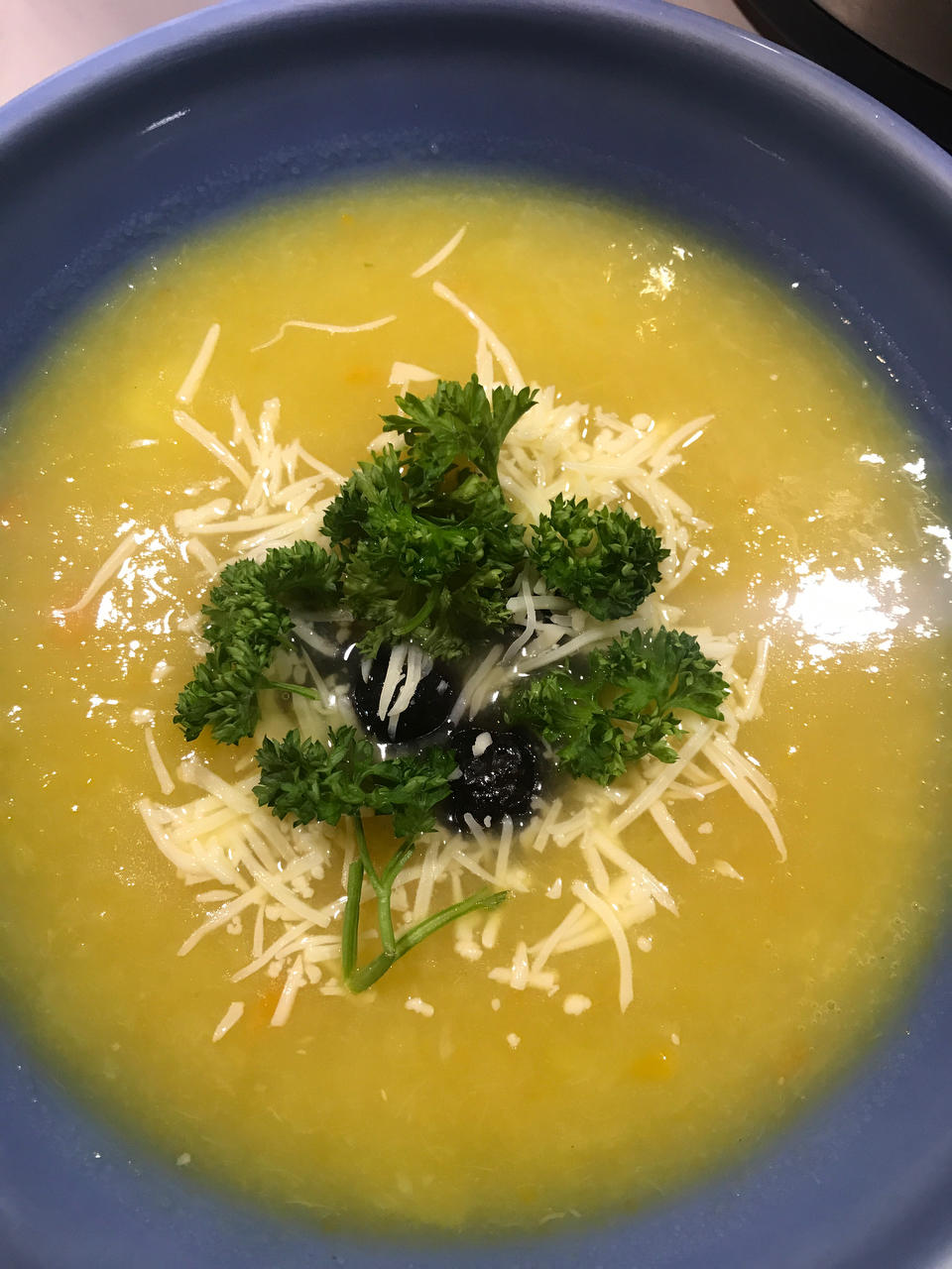 秋冬要喝汤。大葱, 胡萝卜,紫萝卜,还有土豆一起熬,打碎。 最后撒点鹰嘴豆,黑橄榄,荷兰芹,还有一点点芝士。 #晚餐•2...