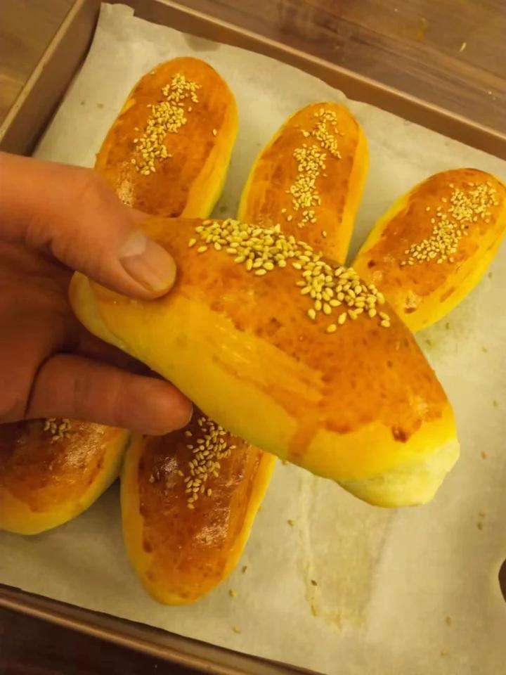 面包刚烤出来底有点焦,里面很软,好吃。