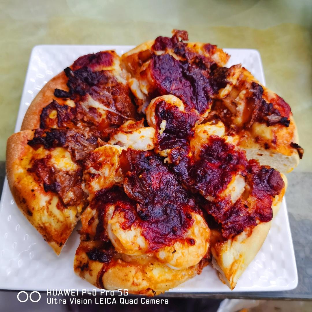 厚底黑椒虾仁披萨。