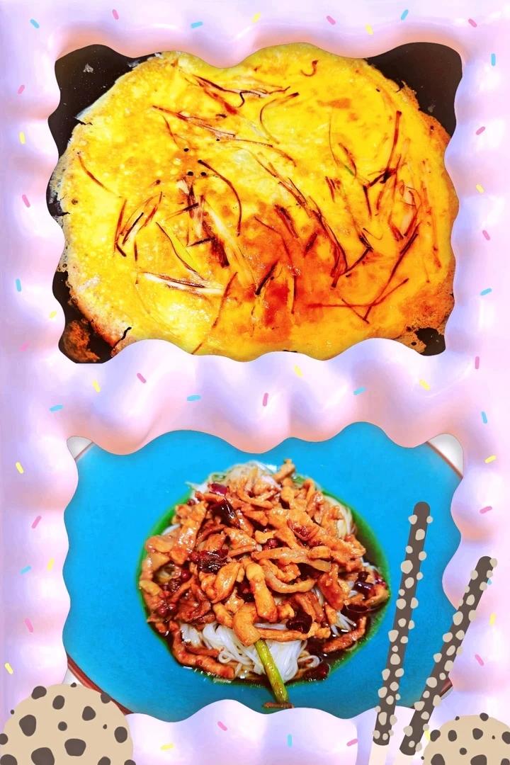 娃的肉丝面,葱丝煎蛋,外加两大杯牛奶😎