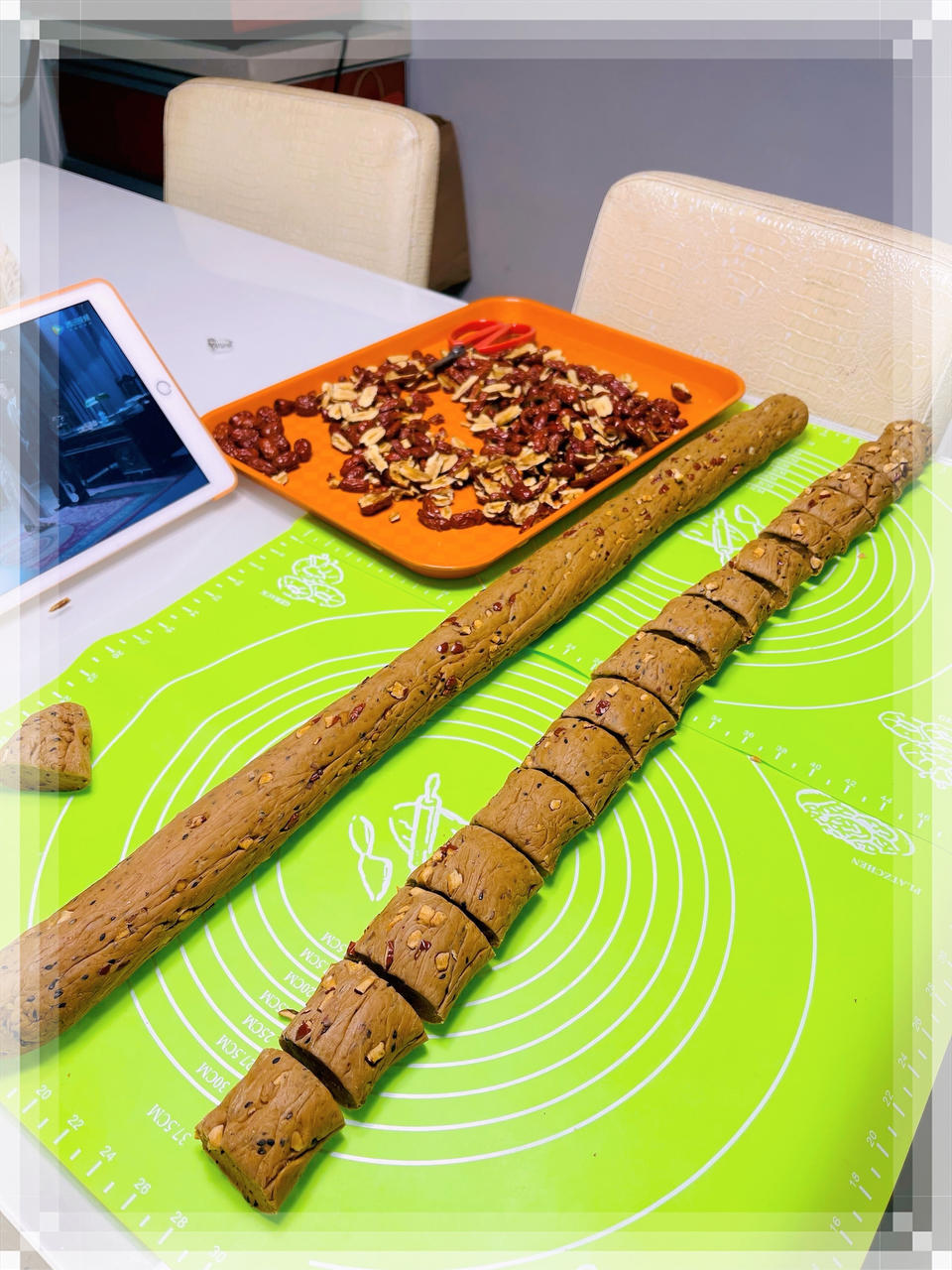 750克面粉,7.5克酵母,2克泡打粉,150克红糖,200克核桃,200克红枣碎,芝麻2把,调整的配方甜度合适,一发后...