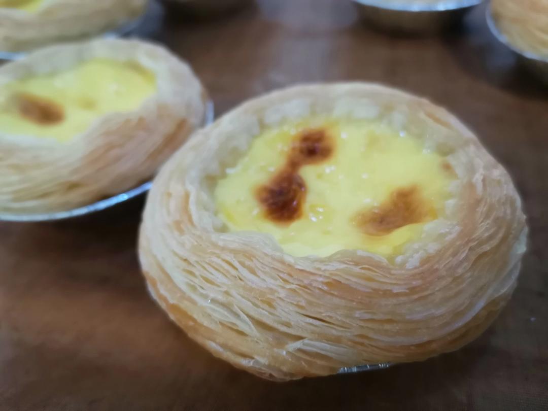 试了评论区一位厨友的方子,很好吃。用了七哥40%安佳黄油的蛋挞皮,出层很好,没有精炼植物油那种糊嘴的感觉。200度中层2...