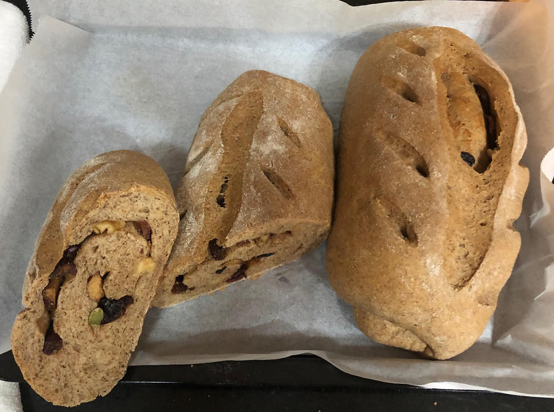 350g全麦面包粉,100g黑麦粉,240ml牛奶,30g水,1个鸡蛋,3g盐,6g酵母,10g黄油。2次和面程序各20...