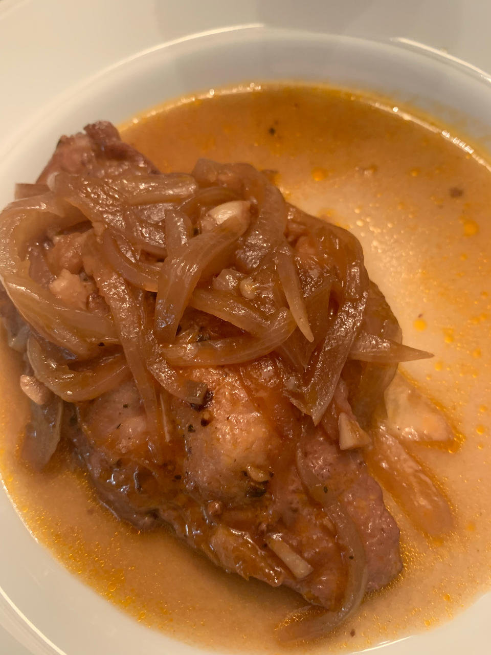 油管上看一个意大利老爷爷做的。猪扒盐胡椒码味,橄榄油两面煎黄取出。煎锅里再加少许橄榄油,下洋葱丝和少许...