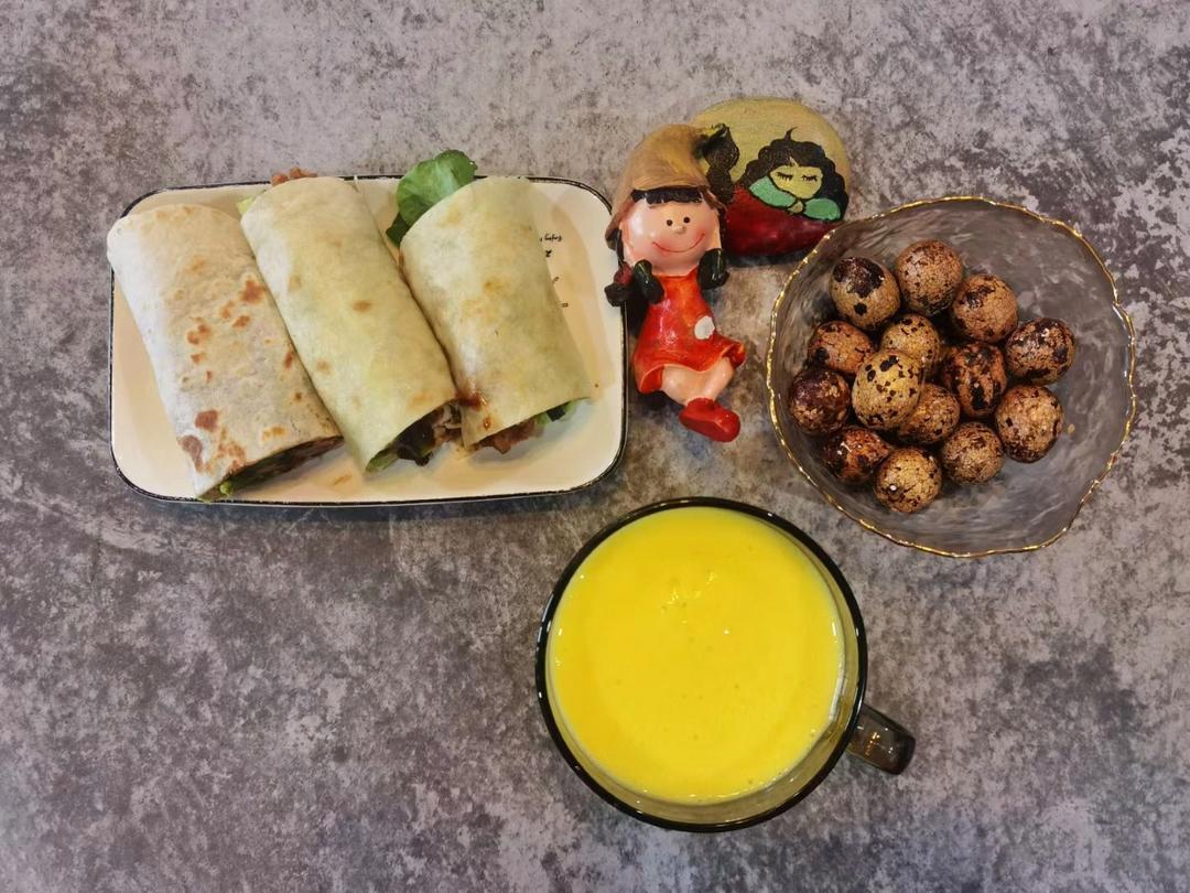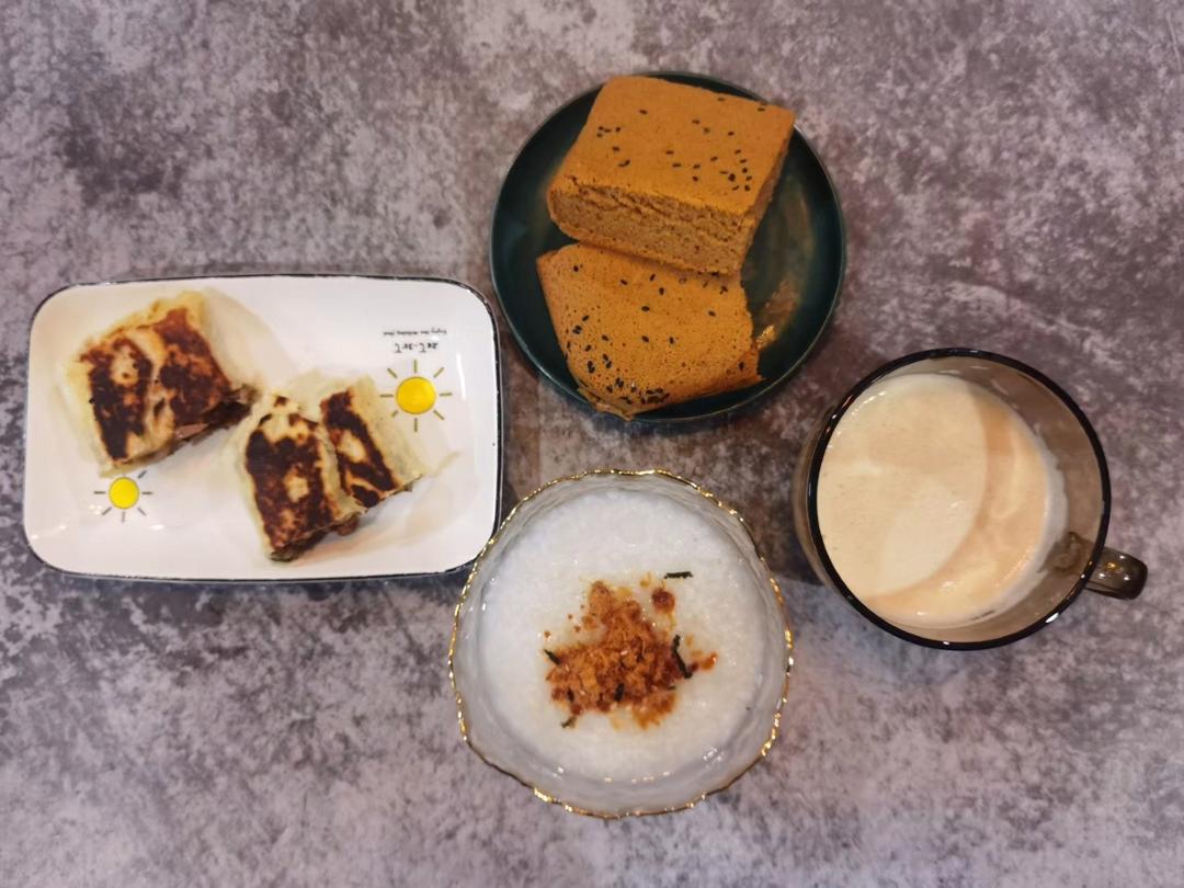 今日份点心:自制枣泥蛋糕,自制芝士牛肉卷,白米粥,花生奶…