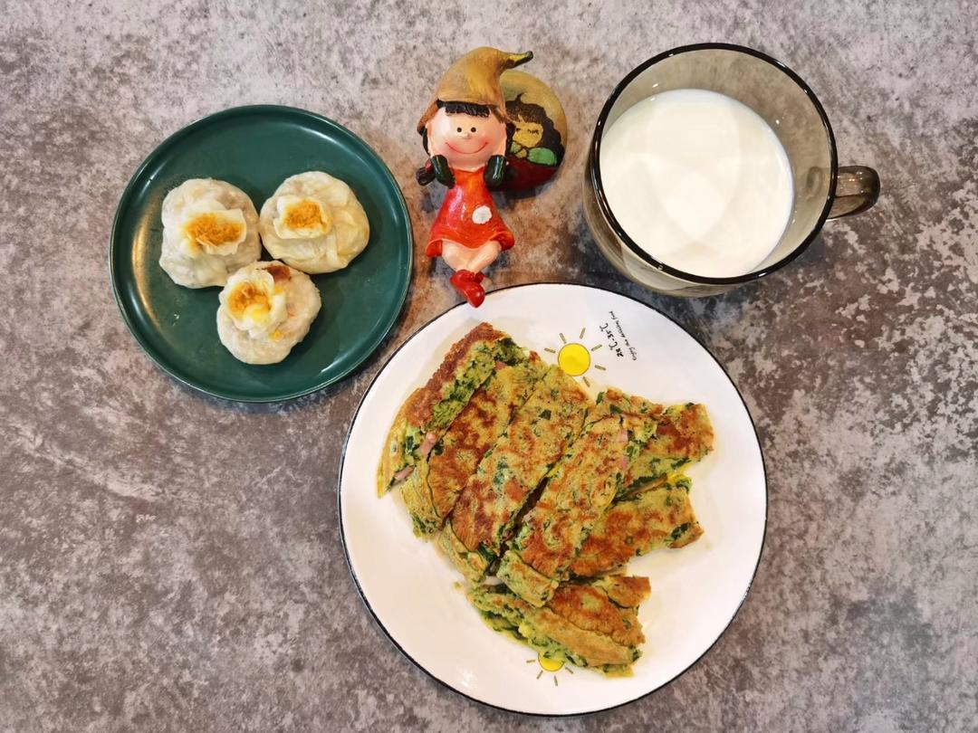 今日份点心:自制咸蛋黄烧卖,自制菠菜芝士鸡蛋饼,牛奶🥛…