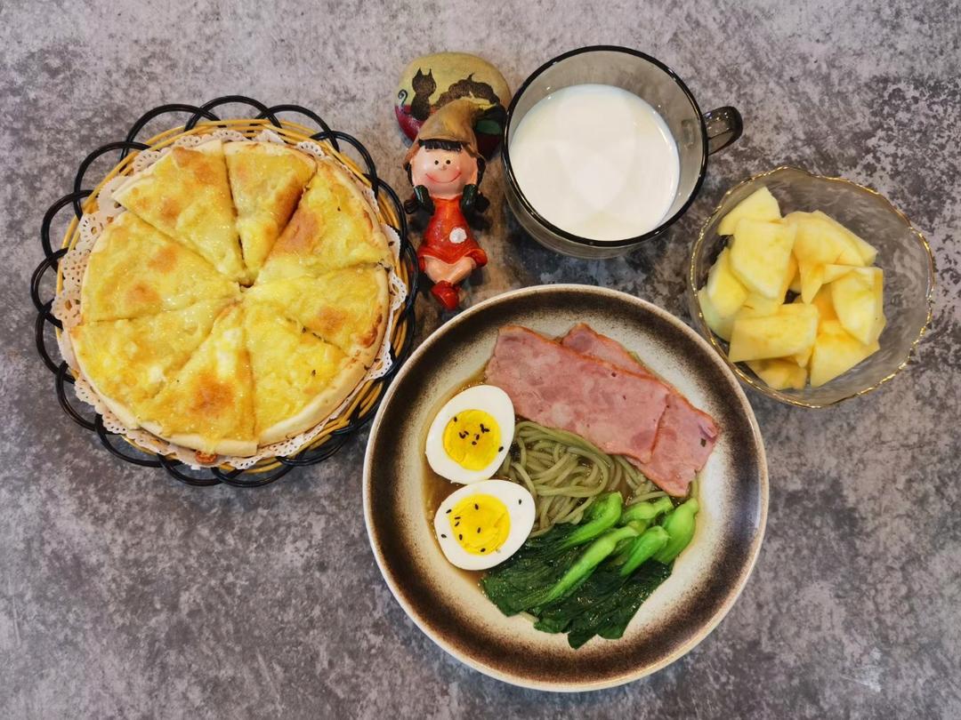 今日份点心:自制榴莲披萨🍕,自制培根鸡蛋青菜面🍜,牛奶🥛,冰糖心苹果🍎…