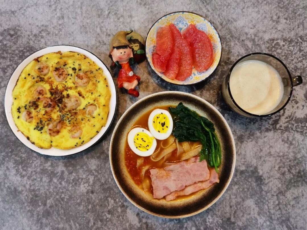 今日份点心:自制土豆虾仁鸡蛋饼,自制培根菠菜番茄面,红心柚,银耳红枣小米奶糊…