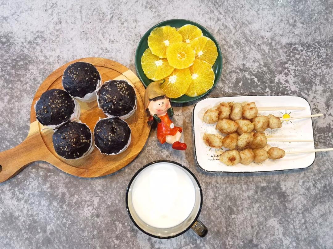 今日份点心:自制虾丸串串,自制黑米糕,牛奶🥛,橙子…
