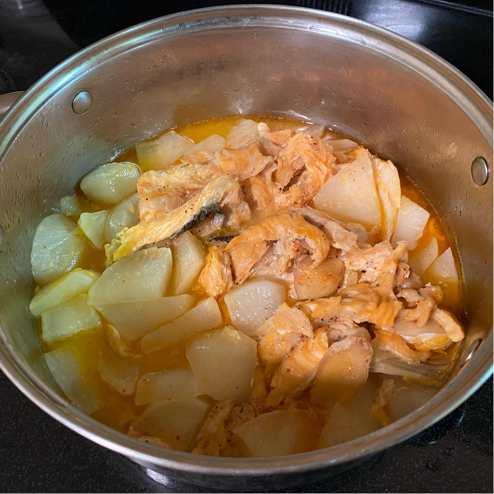 三文鱼萝卜煲,加点泡菜汁调味,鲜味十足!