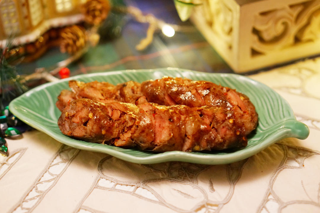 用朋友从四川千里迢迢带来的辣椒面和威士忌腌的肉。下酒菜好吃,征服了不吃腊肠的歪果仁👍🏻。第一次做手艺有待提高,肉塞的不够...