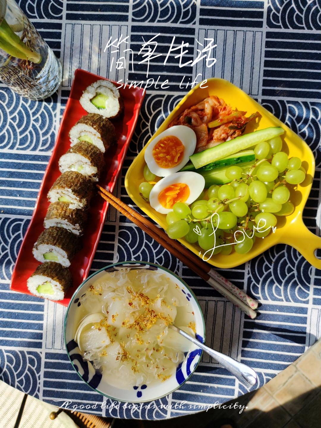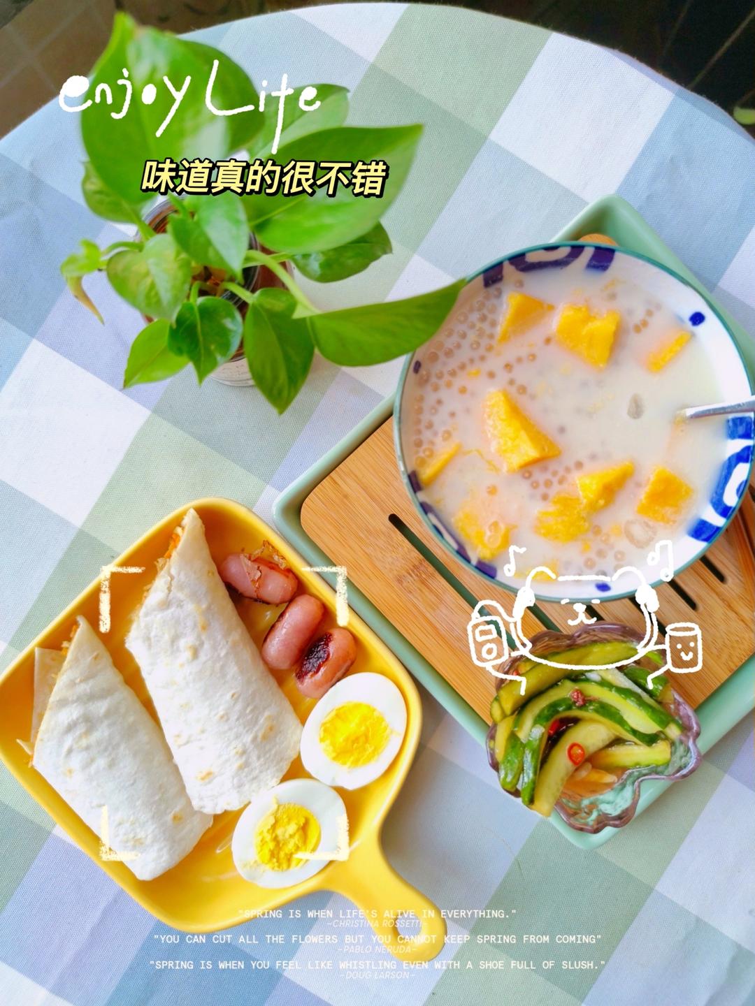 用一夜渍的玻璃罐腌了点黄瓜 。买的椰汁偏甜,煮一碗椰汁芒果西米...