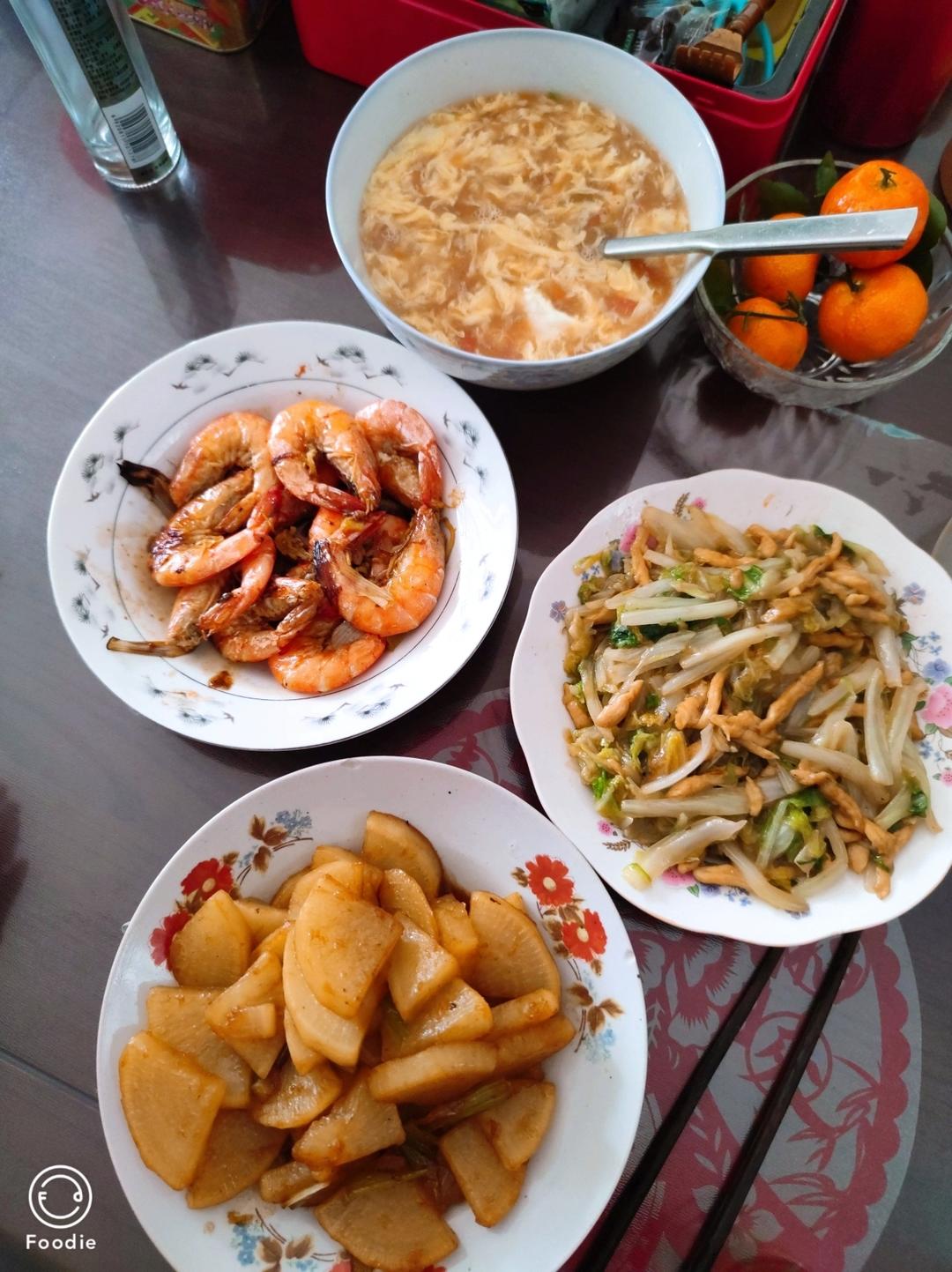 买到了大虾。爸爸今天做的午餐有点丰盛。红烧萝卜意外好吃。下午打拳,然后开胯。脸上笑眯眯,...