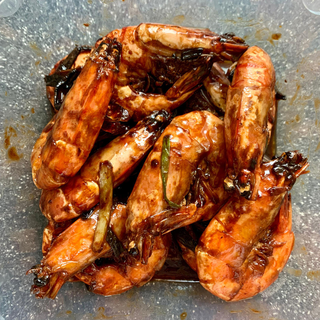 本邦油焖大虾就是浓油赤酱的做法。买的黑虎虾,剪去虾枪虾须,从尾部第二节用牙签挑去虾线,清洗干净后用厨房纸擦干表面的水分。...