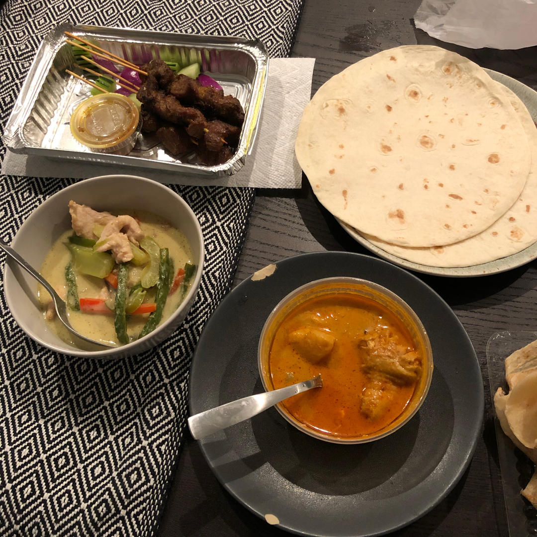 时隔半年,被体重秤影响的🐸今天不做饭。点了绿咖喱,沙爹牛肉串和马来煎饼。胖斧沉舟概念