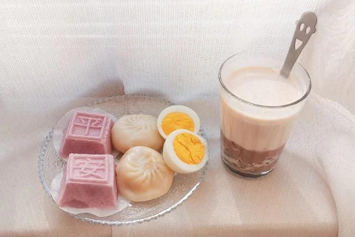 米糕、蟹粉小笼、🥚、红豆牛奶