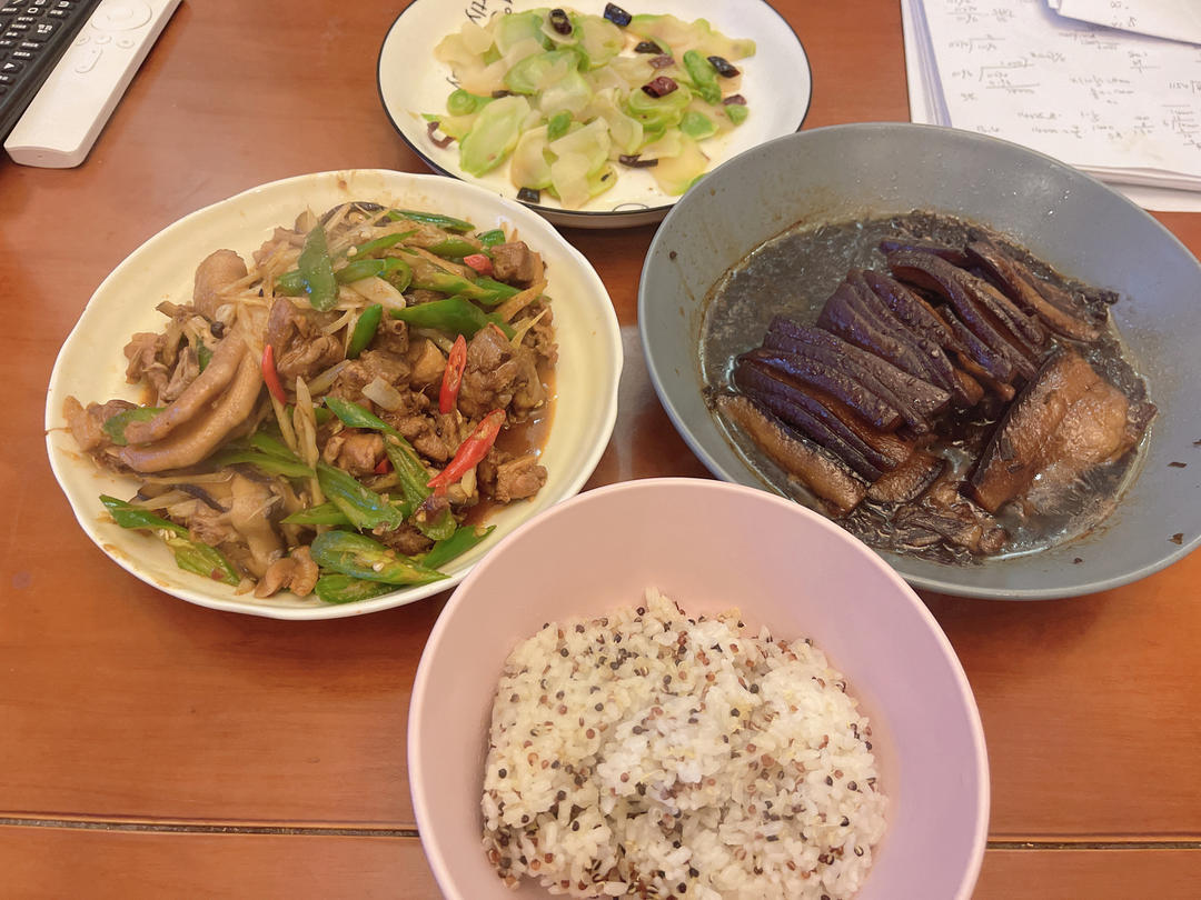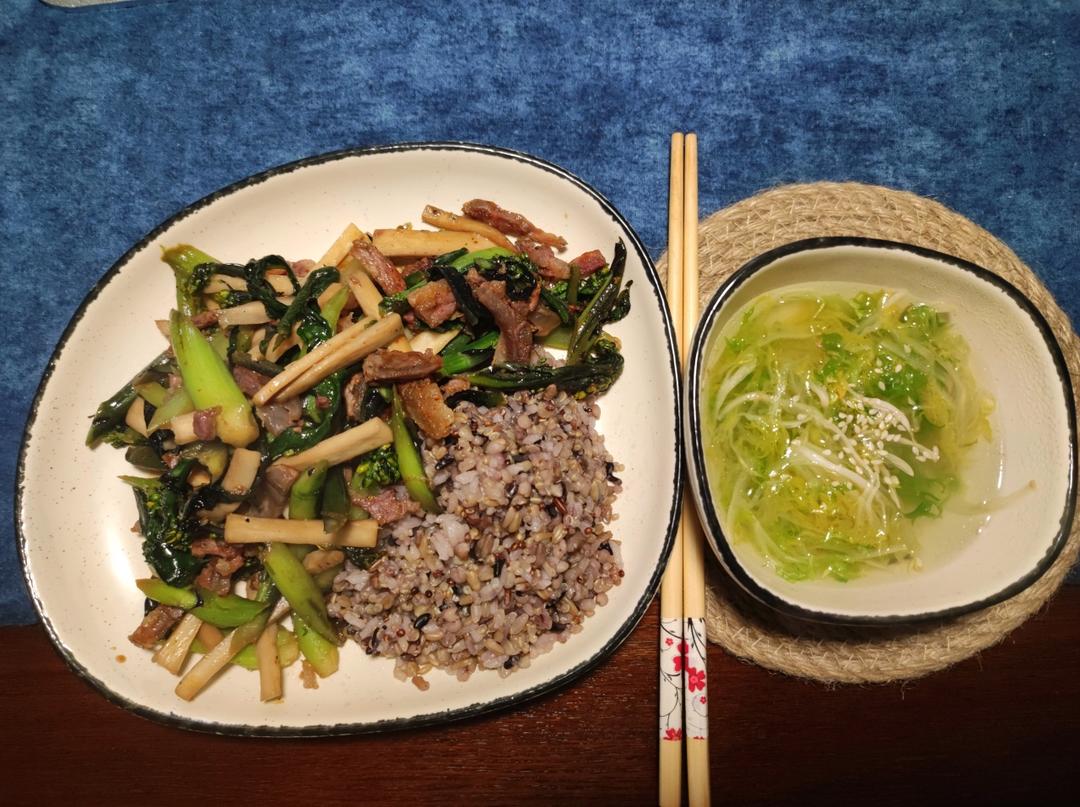 杏鲍菇香肠炒红菜苔盖浇杂粮饭/芝麻苦菊汤