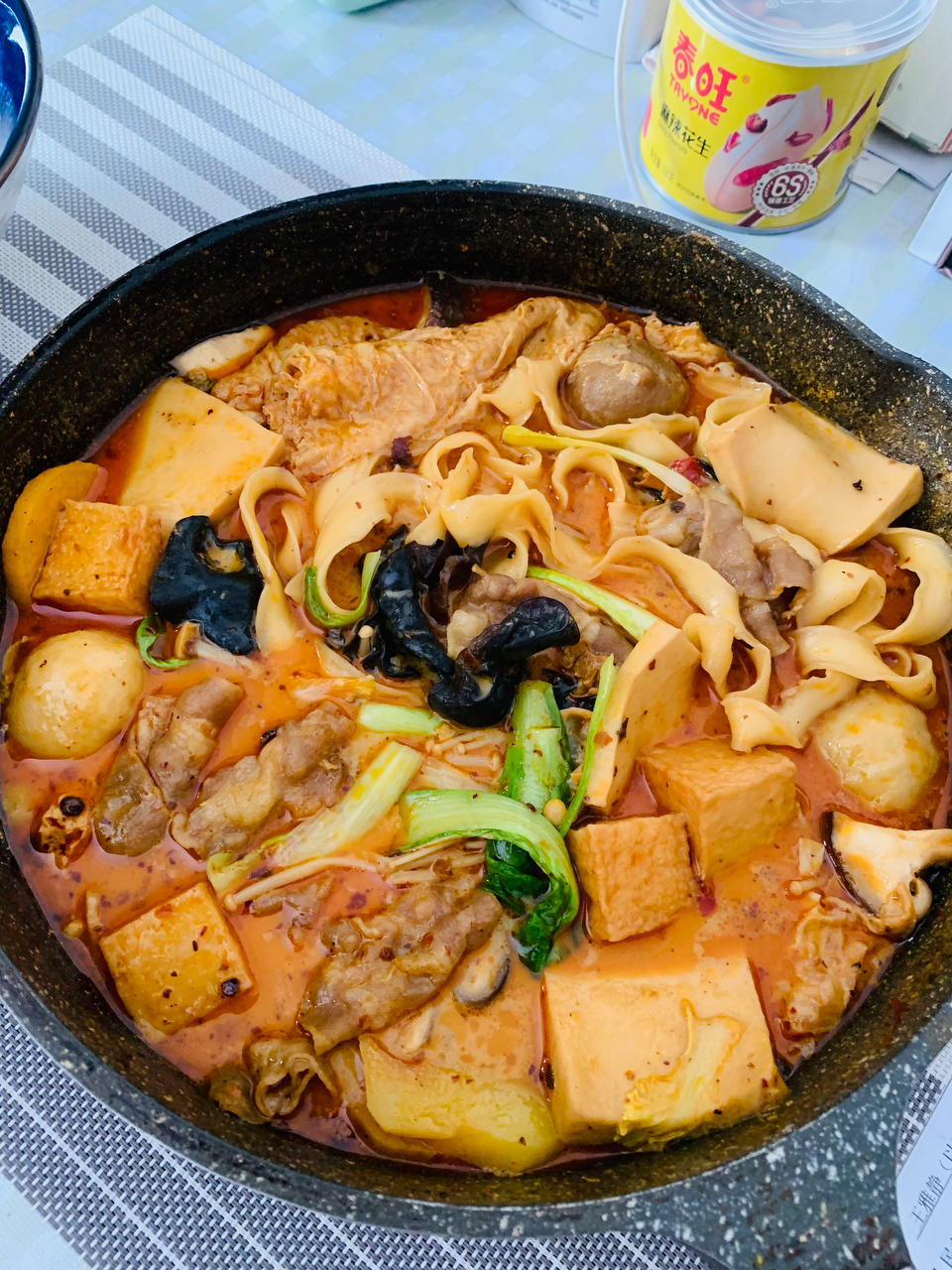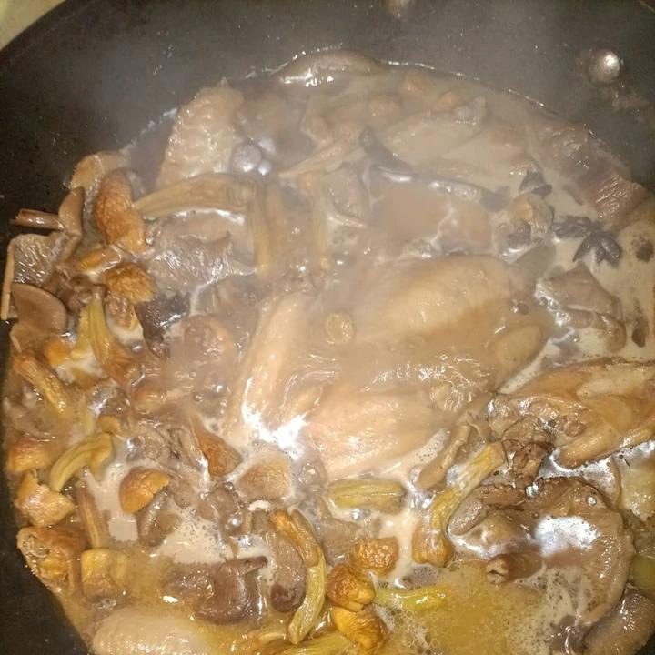 分享图片 快手菜,好做好吃!放的姬松茸和茶树菇,没有事先腌翅中,直接放的白胡椒粉和料酒,还放了麻辣油,最后放豆皮两张炖一...