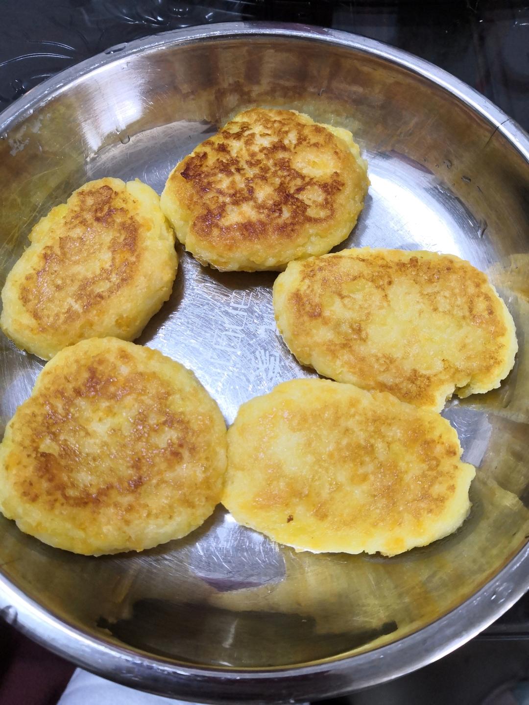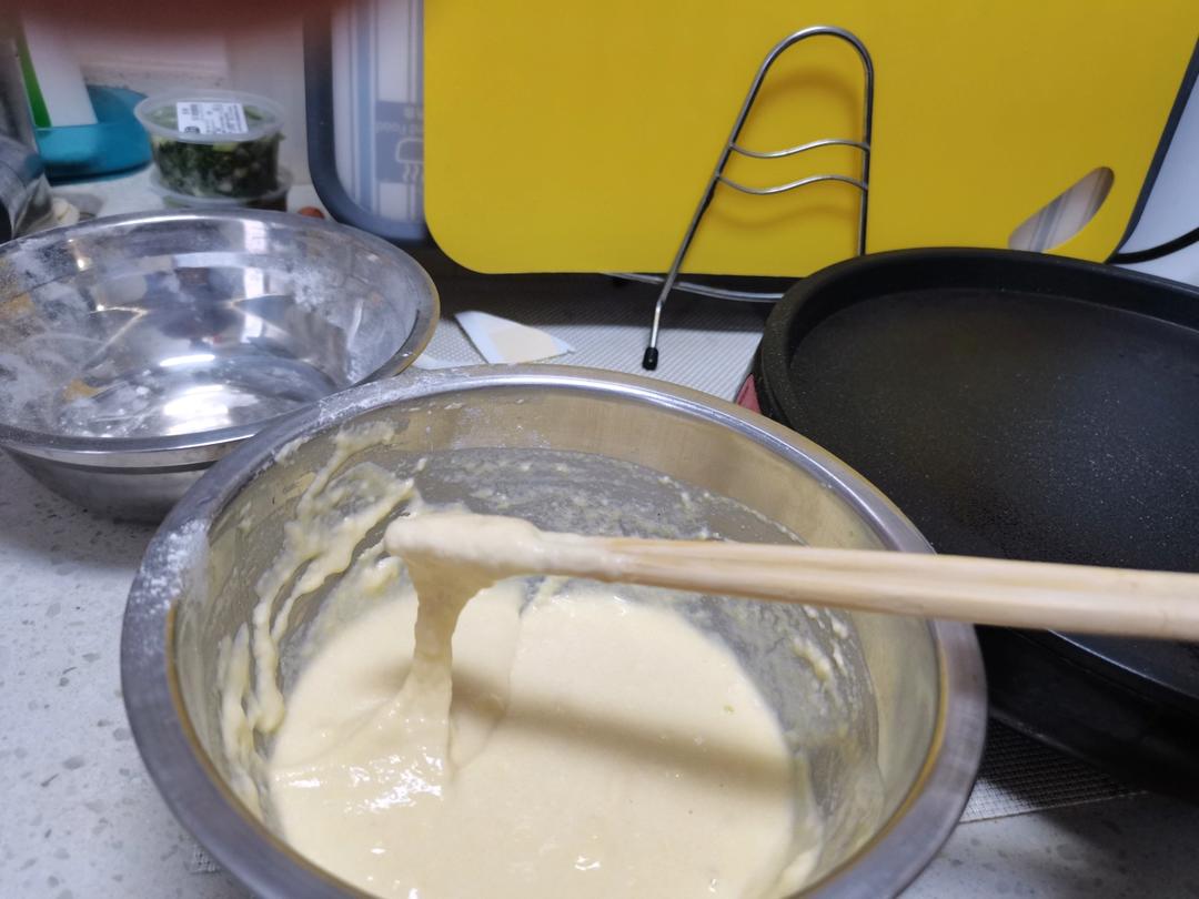 一人份杂粮煎饼,白面60g,玉米面30g,共90g,水一点一点加,直到活到图一的样子。电饼铛刷油。倒面糊。面糊成型后,磕...
