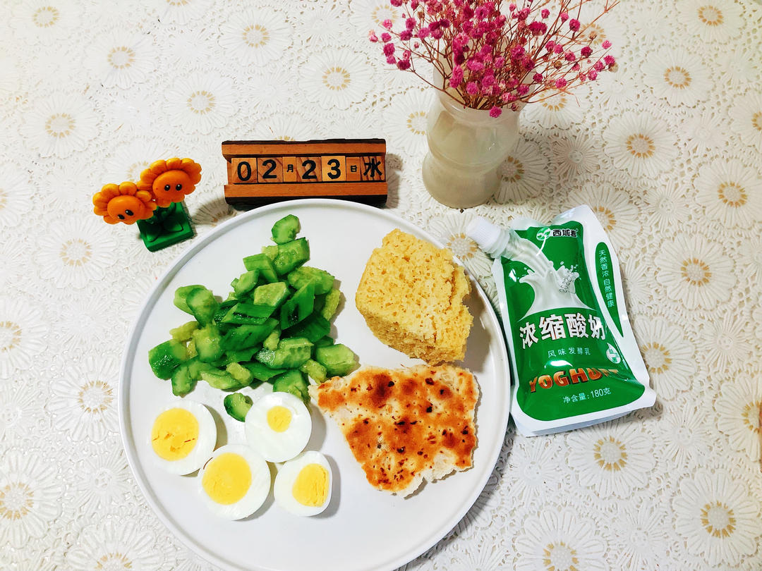 凉拌黄瓜🥒,煮鸡蛋,馕饼,发糕,酸奶