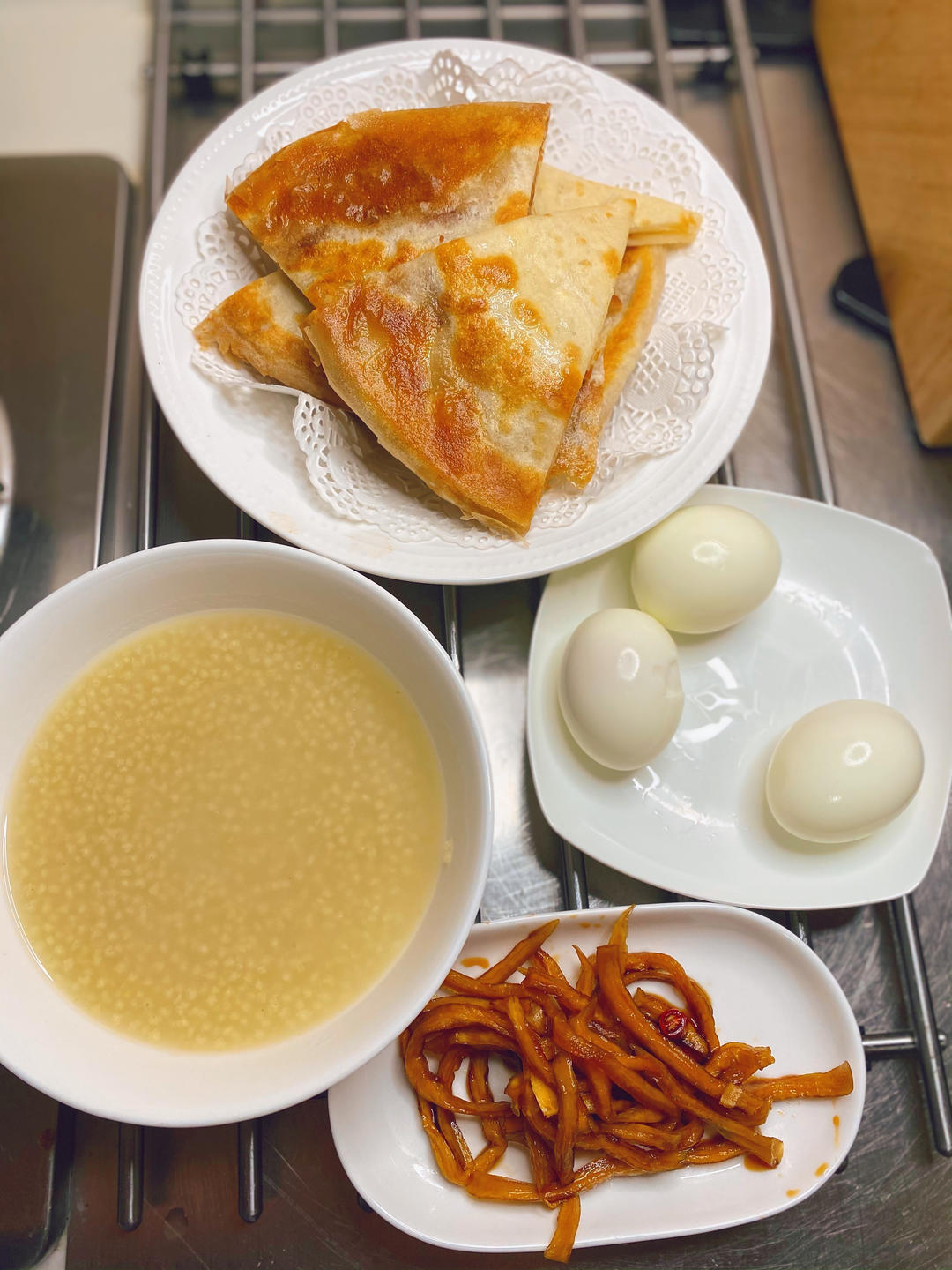 花生酱饼,鸡蛋,咸菜,小米粥