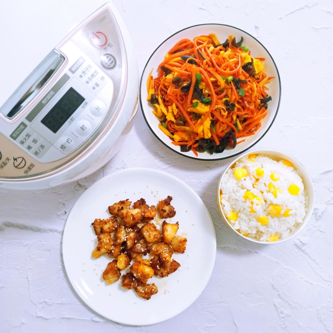 胡萝卜丝炒鸡蛋黑木耳、炸鸡米粒和水果玉米饭