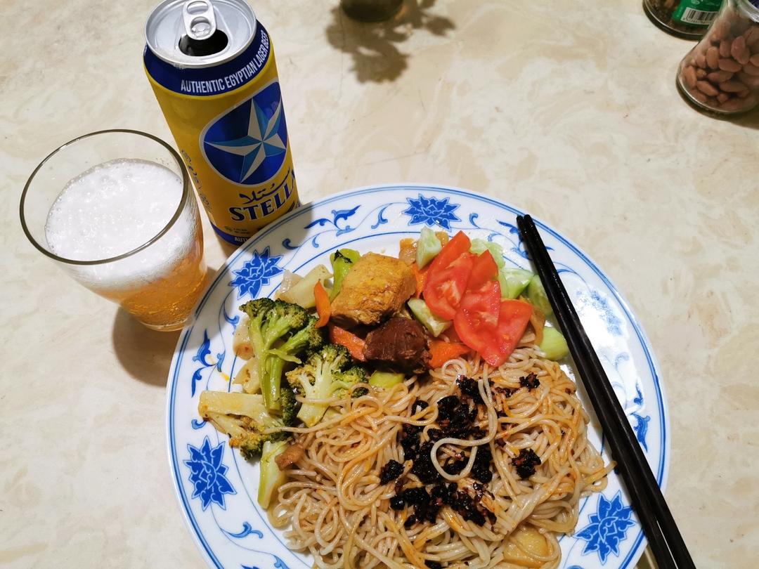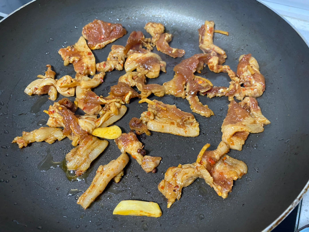 自制烤肉,各种酱料腌五花,若干小时平底锅煎,蒜片儿杭椒卷起来,设备虽不齐全,但也解了馋。