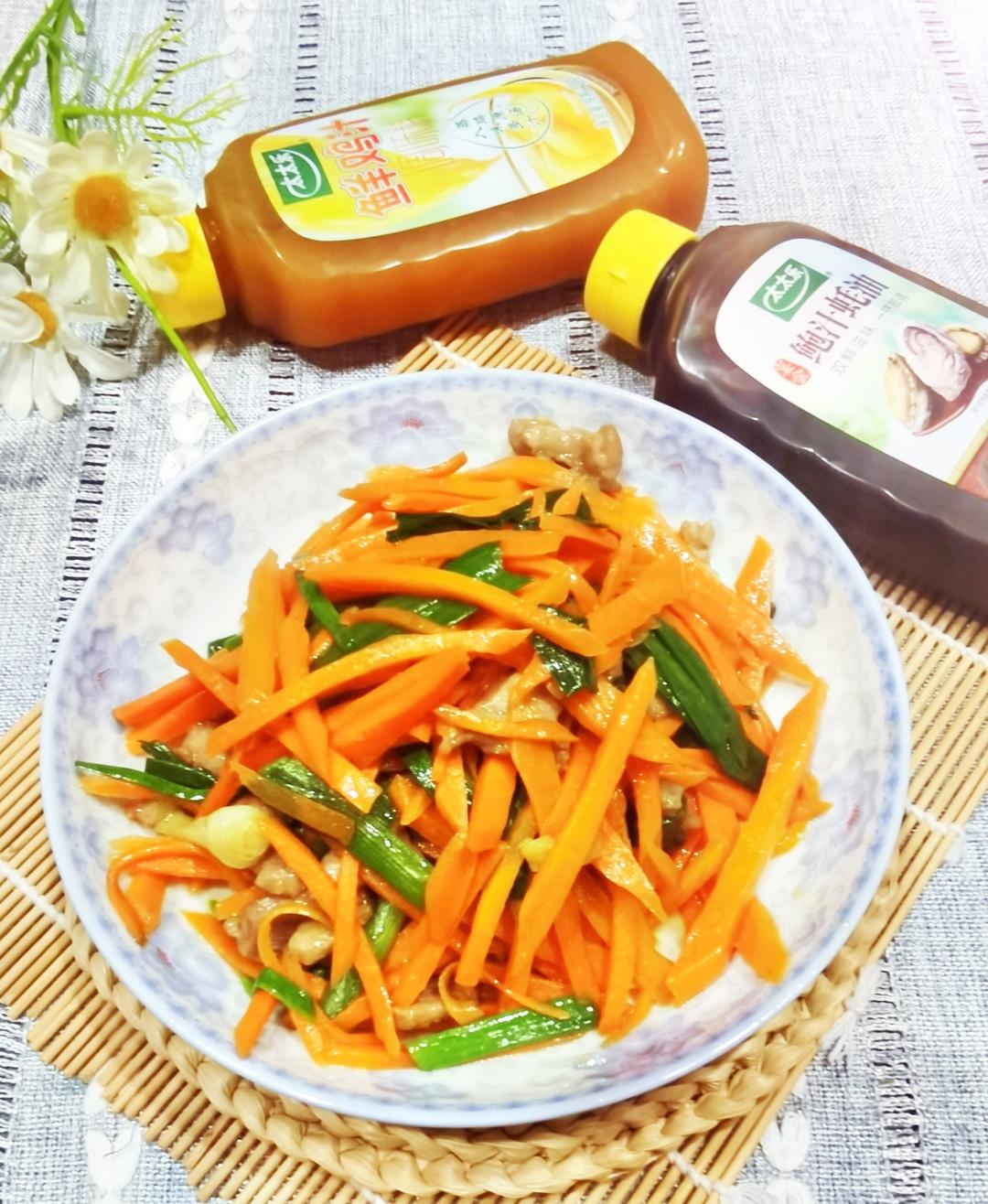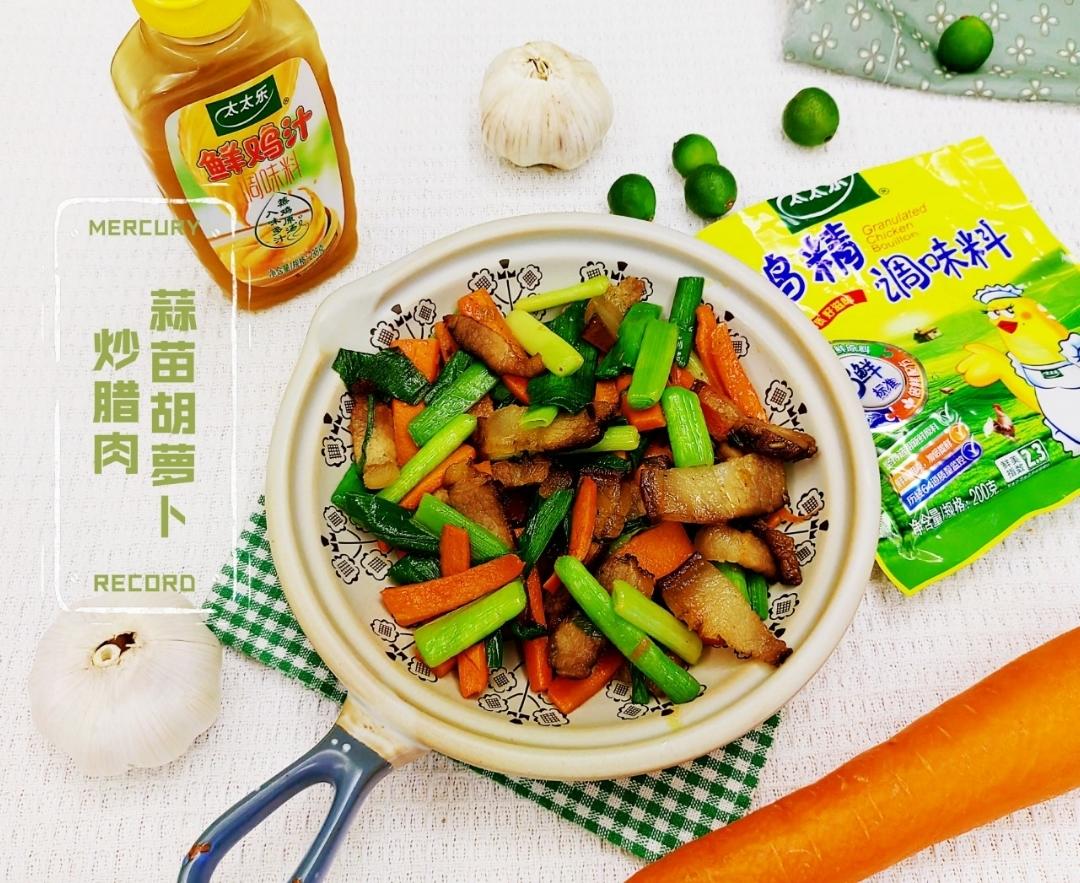 蒜苗胡萝卜炒腊肉。挤出一丢丢太太乐鸡汁和鲜鸡精调味即可,翻炒片刻即可出锅。醇香鲜美😋