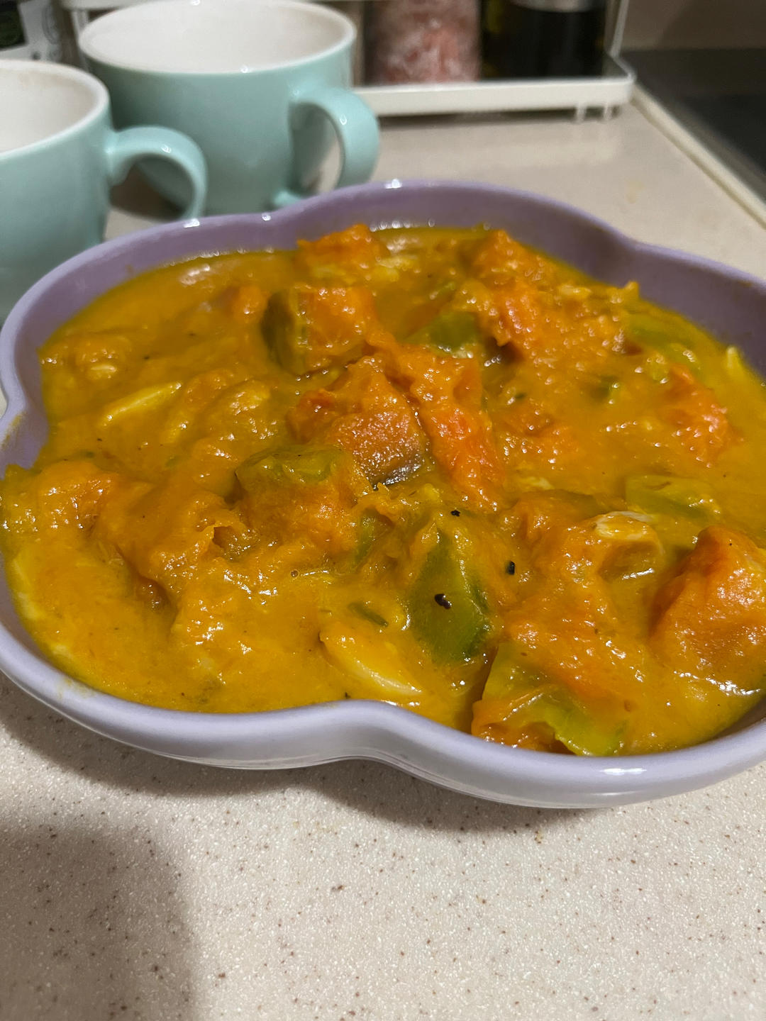 這次煮得不好,椰奶和水加太多超過2/3,想收汁把南瓜都快煮融了🥲